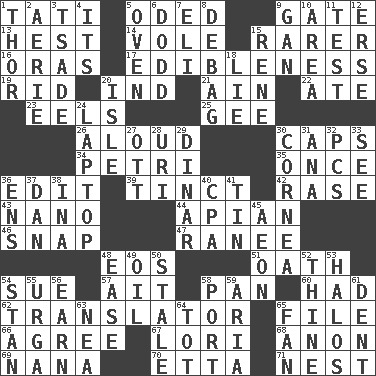ACROSS 1. Jacques of French films 5. Wrote a lyric poem 9. Yard entry 13. Command 14. Short-tailed, large-bodied rat 15. Less widely known 16. Mouths or openings 17. The property of being fit to eat 19. To free from 20. Working for oneself (abbr.) 21. The 18th letter of the Arabic alphabet 22. Had dinner 23. Snakelike fish 25. Unit of force equal to gravity 26. Verbally 30. Smile enhancers 34. _ dish (used to culture cells) 35. Single time 36. Prepare for publication 39. Tinged 42. Raze (variant) 43. Billionth: prefix 44. Bee-related 46. Fastener 47. The wife of a rajah (variant) 48. Greek goddess of the dawn 51. Pledge 54. Institute legal proceedings 57. Small island 58. Baking dish 60. Possessed 62. Interpreter 65. Do some clerical work 66. Match 67. Australian parrot (variant) 68. At once, immediately (arch.) 69. Nanny 70. Singer James 71. Egg locale DOWN 1. Son of Odin 2. Nest on high 3. Sadhe (variant) 4. ___ a Wonderful Life 5. Baking chamber 6. Texas town _ City 7. Connecticut Ivy Leaguer 8. Debunk (Brit. slang) 9. Separate the seeds from cotton 10. Length times width 11. Trial 12. Celtic language 15. French philosopher Descartes 18. Whopper 20. Small island 24. Portable computer 27. Baseball player Mel 28. RI univ. 29. Middle Eastern gold or silver currency 30. Pupil covering 31. Santa ___, CA 32. Personal Computers (abbr.) 33. Perceive with the eye 36. Followers of ems 37. Daniel's nick name 38. _ tizzy (2 wds.) 40. Numbers guy (abbr.) 41. Metal container 45. Age 48. Comfort 49. Petroleum 50. Showing deterioration from age 52. One or ones belonging to thee 53. Radiant circles of light 54. Comedian Laurel of Laurel & Hardy 55. Capital and largest city of Mongolia 56. Merit 58. Left side of a ship or aircraft 59. Roberta Peters solo 61. Incision 63. Teachers' org. 64. Small child 65. Avid follower