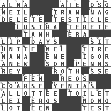 ACROSS 1. _ mater 5. Had dinner 8. Bear (Spanish) 11. Famous astronaut Armstrong 12. SW Asia republic 13. Tired old horse 14. Keyboard key 17. One of the two male reproductive glands 19. A period of five years 21. Cigar-shaped 22. Hyperbolic tangent 23. Epoch 24. Mouth edge 27. 24-hour periods 29. Be seated 32. Join together 34. Cartoonist voice _ Blanc 36. Hoop that covers a wheel 37. Nanny 38. Compass dir. 39. Russian composer Stravinsky 40. Afresh 41. Manchild 42. Actor Sean's family 43. Marina Del _, California 44. Writer of Portnoy's Complaint (1969) 46. Compass dir. 47. Opposite of masc. 50. Vintage cars 52. Unrefined 55. Gossips 57. One to whom something is allotted 59. Bathroom plumbing fixture 62. Luau accessory 63. Greek god of love 64. Words to Nanette 65. Car dealer's back yard 66. Car or cant ending 67. Trial DOWN 1. Also 2. Area sheltered from the wind 3. Place where flour is made 4. Native American of Southwest Alaska 5. "We ___ not amused" (Victoria) 6. Clothes sense 7. Keyboard key 8. Single time 9. Table seasoning 10. Double curve, resembling the letter S 12. Call ___ day 15. Sadhe (variant) 16. Inactive volcano in Sicily 18. Lyricist Gershwin 20. Poems 24. Type of eclipse 25. Lacking in sense or substance 26. Abounding in pines 28. Sir (Sp.) 29. Omens 30. Metal shackles 31. Laconic 33. The 23rd letter of the Hebrew alphabet 35. Poe poem 36. Standoff 42. Picture 45. Portable shelter 47. Back 48. First name in cosmetics 49. Distance measurement (Brit.) 51. Virtuous person 52. Give a ring to 53. Butter sub 54. Came down and settled, as after flight 55. Consenting reply 56. _ gin 58. Period of immesurable duration 60. Followers of ems 61. Small child