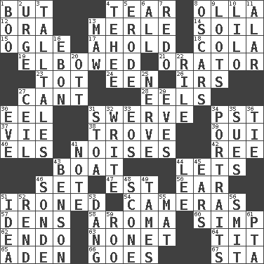 ACROSS 1. Yet 4. Lacerate 8. Water jar 12. Mouth or opening 13. Haggard of country music 14. Earth 15. Stare at amorously 17. Hold, grip (Informal) 18. Root beer relative 19. Shoved, as through a crowd 21. Speaker 23. Small child 24. Car or cant ending 26. Big collection agency 27. Patter 28. Snakelike fish 30. Snakelike fish 31. Turn aside suddenly 34. Pacific Standard Time (abbr.) 37. Compete 38. Collection of objects 39. Fr. "Yes" 40. Raised railways 41. Annoying sounds 42. To riddle 43. Water vessel 44. Allows 46. Put into a specified state 47. Eastern Standard Time (abbr.) 50. Hearing organ 51. Pressed 54. Devices for capturing images 57. Habitations of wild animals 58. Scent 60. Simple or foolish person 62. Inside; within (prefix) 63. Music written for nine 64. Teat (slang) 65. Arabian gulf 66. Travels 67. R.R. building DOWN 1. Surprise greeting 2. Goad 3. Baron Munchausen's specialties 4. Giggle 5. Eat (away) 6. Everything 7. Do over again 8. Motion picture awards 9. Plunders 10. _ and Stitch 11. Having or resembling wings 13. Opening into something insatiable 16. Inky black, to poets 20. Baseball player Mel 22. Cause heat under the collar 25. Boldness 27. To provide with a ceiling 29. Nights before holidays 30. First lady 31. Portico 32. Compose 33. Greek goddess of the dawn 34. Likenesses of persons 35. Takes to court 36. Make a knot 41. Make mention of 43. Gillaume's butler role 44. Area sheltered from the wind 45. Hearing organs 46. Something which is sent 48. Biscuitlike quick bread 49. Softens 51. It may be bright or harebrained 52. Tear apart 53. Mild oath, euphamism for damn 55. Floor protector 56. Stricken, poetically 59. Friend of Pooh 61. Parent Teacher Assoc.