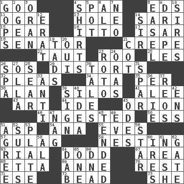 ACROSS 1. Thick or sticky substance 4. Connect, as a bridge 8. Begley and Asner 11. Legendary monster 13. Hollow 14. Indian skirt 15. Lightbulb-shaped fruit 16. "Tell ____ the Marines!" 17. Austrian river, tributary to the Danube 18. Legislator 21. Streamer paper 22. Strained 23. Friend of Pooh 25. French article 26. Distress signal 29. What propaganda does 32. Entreaties 34. _ moment's notice (2 wds.) 35. For each 38. Actor Alda or Thicke 39. Grain storage towers 41. Toward shelter 43. Nonscientific branch of learning 44. Binary compound 45. Constellation of myth 46. Eaten 50. Double-curved letter 51. Viper 54. Santa ___, CA 55. Nights before holidays 57. POW camp 59. Snuggling 63. Monetary unit of Yemen 64. Texas town _ City 67. Length times width 68. Singer James 69. Singer Murray 70. Repose 71. Compass dir. 72. Necklace unit 73. A female animal or person DOWN 1. Republicans 2. Double curve, resembling the letter S 3. Northwest Algerian city 4. Upper-body garments 5. Plant holder 6. The first octave above the treble staff 7. Modern: prefix 8. Artist's stand 9. Window treatment 10. Fathers 12. Part of Q.E.F. 14. Title for a knight 19. Small amounts or degrees 20. Fr. "Yes" 21. Small bed 23. Printing process, for short 24. Mouths or openings 26. Health resort 27. Rounded earthenware pot or jar 28. Shrivel 30. Lies 31. Coast Guard woman 33. Opposed to 36. Writer Wiesel 37. Vintage cars 39. Public display of a written message 40. It may be bright or harebrained 42. Followers of ems 45. Lyric poems 47. Tired old horse 48. Watched over 49. First lady 51. Match 52. Sets or collections 53. Food holder 56. Play the lead 58. Wing 60. Angers 61. Delicate 62. Yard entry 64. Pat or tap gently 65. Single 66. Heredity factor (abbr.)