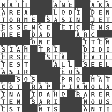 ACROSS 1. Electrical Unit 5. A saturated hydrocarbon 8. Alias (abbr.) 11. Length times width 12. Farming town in central California 14. Lair 15. Singer Mel 17. Indian antelope 18. Type of plane 19. Center 21. And so on (abbr.) 22. Followers of ems 23. Portuguese money of account (variant) 24. June honoree 25. Curve 27. Single 28. A distinct part 31. Thailand, formerly 35. Three (prefix) 37. "You Light Up My Life" star Conn 38. Celtic language 39. R.R. building 41. Morally bad or wrong 42. Trial 43. Everything 45. Stitch closed the eyes of (a falcon) 46. SW Saudi Arabia district 47. Greek goddess of the dawn 49. Distress signal 51. Adept person 52. Floor protector 55. Small bed 57. Hit sharply and swiftly 60. Player piano 62. _ tizzy (2 wds.) 63. Potato state 65. More valued for its uncommonness 66. "___ Little Indians" 67. Indian skirt 68. Good sense 69. Eastern Standard Time (abbr.) 70. Mountains (abbr.) 71. Opposed to DOWN 1. Wetness 2. Came up 3. Laconic 4. Not wild 5. Chicken ___ king 6. Characteristic smell of wine 7. Prepare for publication 8. Descriptive word 9. Peachy ____! 10. Pismires 13. South American Indian 16. Inside; within (prefix) 17. Spring feasts 20. Patter 26. Amusement-park features 29. Singer Brickell 30. Place where flour is made 31. Stalk of a moss capsule 32. Angers 33. Helper 34. Paris' subway 36. Call ___ day 40. City in Syria 44. Australian parrot (variant) 48. Fly high 50. Indian titles of respect 52. Person of subnormal intelligence 53. Native American of Southwest Alaska 54. Tarsus (plural) 55. Quote 56. Washington bills 58. First man 59. Piece 61. Grandmother 64. Part of HMS, perhaps