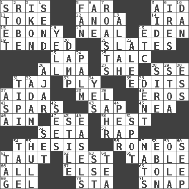 ACROSS 1. Indian titles of respect 5. Distant 8. Help 11. Casino tip 12. Small Philippine buffalo 14. Lyricist Gershwin 15. Black 17. Anneal 18. Locale of original sin 19. Looked after 21. Chalkboards 23. Infant locale 25. Baby powder 26. _ mater 27. A female animal or person 28. Compass dir. 31. _ Mahal 33. Travel a route regularly 35. Proofreads 37. Opera by Verdi 38. Cartoonist voice _ Blanc 40. Greek god of love 41. Practice fights 43. Plant excrement 45. Teachers' org. 46. Direct toward a target or goal 47. Compass dir. 50. Behest 52. Stalk of a moss capsule 53. Hit sharply and swiftly 54. College paper 56. Lover boys 61. Pulled tight 62. For fear that 65. Eating place 66. Everything 67. Otherwise 68. Lacquered or enameled metalware 69. Set 70. R.R. building 71. Fastener DOWN 1. Proofreading order 2. Loose flowing garment 3. Image 4. Transmit 5. Avid follower 6. One (Scot) 7. Cooks with dry heat, as in an oven 8. Assistant 9. Angers 10. Daniel's nick name 13. Assad's deity 16. Shout 18. And so on (abbr.) 20. Moist 22. Toward shelter 24. Inside of hand 26. Partly open 28. Male parent of an animal 29. Portico 30. Double-curved letter 31. Native american tent (variation) 32. First of billions? 34. It is so 36. Incision 37. White ___ sheet 39. Cowardly lion portrayer 42. Perceives with the eye 44. Lightbulb-shaped fruit 48. Vertical member of a panel or frame 49. Artist's stands 51. Specific locale 52. Arrange properly for use 54. Lie 55. Frame or body of a ship 57. Floor coverings 58. Inky black, to poets 59. Rounded earthenware pot or jar 60. Ooze 61. Label 63. Fast jet (abbr.) 64. Beverage made from leaves