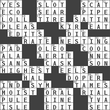 ACROSS 1. Consenting reply 4. Narrow opening 8. Get outta here! 12. Environmental prefix 13. Dry up 14. Corncob 15. Hang loosely or laxly 17. Hoop that covers a wheel 18. Smooth fabric 19. Entreaties 21. Apertif with cassis 23. Erode 24. Proofreads 26. Pass on 28. Assign a rank or rating to 30. Snuggling 34. Writing tablet 37. Margarine 39. Calm and collected 40. In the manner of 41. Nest on high 43. Compass dir. 44. Without 46. Keg 47. Manchild 48. Having the greatest elevation 51. Snakelike fish 54. Actor Linden 55. Drug addict 58. Indiana (abbr.) 61. Symbol (abbr.) 63. Softens 65. Damp 67. Taken by mouth 71. Monetary unit of Yemen 72. Whine 73. Actor's bit 74. Federal power corp. 75. Capri or Wight 76. Prepare for publication 77. Arrange properly for use DOWN 1. Sharp bark 2. Learning spot: Fr. 3. Having a sole or soles 4. Fast jet (abbr.) 5. Flowery wreath 6. Boat paddle 7. Long journey 8. Health resort 9. Quote 10. Capital of Western Samoa 11. Portable shelter 16. Den 18. Indian titles of respect 20. R.R. building 22. Binary compound 25. Portico 27. And so on (abbr.) 29. Choose 30. Annoying sound 31. Charged atoms 32. Words to Nanette 33. Small, secluded valley 34. Romantic infatuation 35. Jai _ 36. Mild oath, euphamism for damn 38. Epoch 42. Made supply last 45. Quiet! 49. 90 degrees 50. Playfully artful 52. Car dealer's back yard 53. Coast Guard woman 56. Sends forth 57. Rob, plunder, or pillage 58. Body of Kaffir warriors 59. Horse sense 60. Deli pickle 62. Undercover agent 64. Narrow board 66. Perceive with the eye 68. To free from 69. Cuckoo 70. Allow
