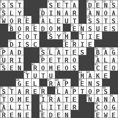 ACROSS 1. Fast jet (abbr.) 4. Stalk of a moss capsule 8. Cub Scout units 12. Mischievous 13. Middle Eastern gold or silver currency 14. Small Philippine buffalo 15. Had on 17. Native American of Southwest Alaska 18. Fast planes 19. Mood resulting from idleness 21. Follows as a consequence or result 23. Small bed 24. Symbol (abbr.) 26. Make a knot 27. Compact _ 28. One of the Great Lakes 30. Groovy apt. 31. Chalkboards 34. Paper or plastic container 37. RI univ. 38. Stone: prefix 39. Insect wing 40. Elected rep. 41. Lover boys 42. Corporate head (abbr.) 43. Ballerina skirt 44. Cause to be 46. Set 47. Hit sharply and swiftly 50. Followers of ems 51. A viewer who gazes fixedly 54. Portable computers 57. Heavy book 58. Feeling or showing extreme anger 60. Nanny 62. Set down 63. 61 cubic inches 64. Gear tooth 65. French philosopher Descartes 66. Locale of original sin 67. She-sheep DOWN 1. Compass dir. 2. Messy guy 3. Polypeptide antibiotic 4. Grain storage towers 5. Foe 6. The 19th letter of the Greek alphabet 7. Johnson of "Laugh-In" 8. Hyrax 9. Follow as a consequence or result 10. Observe 11. Backtalk 13. June honoree 16. Greek god of love 20. And so on (abbr.) 22. Nuclear Threat Initiatives 25. Paris' subway 27. Have the gumption 29. Vintage cars 30. Suppuration 31. Specific locale 32. Arboreal primate 33. Had dinner 34. Keyboard key 35. Toward shelter 36. E Mali city 41. General guideline 43. Cigar-shaped 44. Was introduced to 45. At once, immediately (arch.) 46. Homeless child 48. Having winglike extensions 49. Eucharist need 51. Play the lead 52. Lacquered or enameled metalware 53. Cause heat under the collar 55. For each 56. Frozen precipitation 59. To free from 61. Ripen