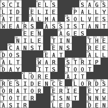 ACROSS 1. _-fi 4. Raised railways 7. Sinks 11. Hat (slang) 12. Writer Wiesel 13. Chummy 14. Had dinner 15. _ mater 16. Finds the solution 17. Puts on (as clothing) 19. Aide 21. Car or cant ending 23. Matures 24. The longest river in the world 25. Shallow baking pan 26. Definite Article 29. 2nd pers. sing. pres. of can (arch.) 30. Followers of ems 31. To separate or throw off 32. Two (Sp.) 33. Ingest 34. Everything 35. Keyboard modifier key 36. Armed conflict 37. Remove all contents or possession from 40. 24 hours 41. ___ a Wonderful Life 42. A blast of a horn 43. Old wives' tales, e.g. 45. Small island 46. Dwelling 51. Nobles 55. Speaker 56. One of the Great Lakes 58. Sight organ 59. Carrier 60. Is not 61. Compass dir. 62. SW Saudi Arabia district 63. Directed 64. Lair DOWN 1. Cole _ (cabbage dish) 2. Quote 3. The content of cognition 4. Pipe bend 5. Pale green bean 6. Oceans 7. Table seasonings 8. Inventor's middle name 9. Small, secluded valley 10. System (abbr.) 12. Artist's stands 13. Airs 16. Public displays of written messages 18. It's straight from the horse's mouth 20. Inhabitant of Heaven 22. Fish or hair follower 24. Characterized by obscenity 25. Pulls apart 26. Distinguishing feature 27. Aid 28. Snakelike fish 29. Root beer relative 32. Male parent 33. Consumed 36. One who wires 37. R.R. building 38. Bathroom 39. Printing process, for short 43. 61 cubic inches 44. Scent 46. Round or rotation of duties 47. Greek god of love 48. Suttee (variant) 49. To provide with a ceiling 50. Celtic language 52. Tear apart 53. Unit of force 54. Stitched 57. Indiana (abbr.)