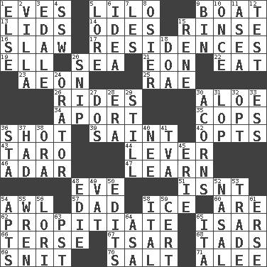 ACROSS 1. Nights before holidays 5. _ and Stitch 9. Water vessel 13. Hats (slang) 14. Lyric poems 15. Remove soap 16. Cole _ (cabbage dish) 17. Dwellings 19. Pipe bend 20. Ocean 21. Period of immesurable duration 22. Consume 23. A really long time 25. Actress Charlotte 26. Amusement-park features 30. Medicinal plant 34. To the left, to Queeg 35. 911 reaches them 36. Guess 39. Virtuous person 42. Elects 43. Edible starchy tuberous root 44. Prying instrument 46. The sixth month of the Jewish calendar 47. Memorize 48. First lady 51. Is not 54. Leather borer 57. Male parent 58. Frozen water 60. "We ___ not amused" (Victoria) 62. Conciliate 65. Austrian river, tributary to the Danube 66. Laconic 67. Russian ruler of old 68. Small amounts or degrees 69. In a ____ (agitated or irritated) 70. Table seasoning 71. Toward shelter DOWN 1. Otherwise 2. Country estate 3. Peak District village in England 4. Compass dir. 5. Old wives' tales, e.g. 6. The content of cognition 7. French article 8. Flexible twig of a willow tree 9. Storage container 10. Single time 11. At sea 12. Trial 15. French philosopher Descartes 18. ___ good deed 20. Clip 24. Speaker 27. Two (Sp.) 28. Epoch 29. Free from disturbance or agitation 30. Oak nuts 31. Trim (branches) 32. Elect 33. Curvy letter 36. R.R. building 37. Possessed 38. Mouth or opening 40. Born 41. Federal power corp. 45. One of the Great Lakes 48. Singer Brickell 49. Large container 50. Proofreads 52. Relating to the nose 53. Barter 54. Tenement units (abbr.) 55. Songbird 56. Australian parrot (variant) 58. Slanted text style (abbr.) 59. Foregone conclusion 61. Celtic language 63. Pacific Standard Time (abbr.) 64. White ___ sheet 65. Call ___ day