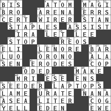 ACROSS 1. Again 4. Tiny particle 8. Wise men 12. Sis' sibling 13. Sports stadium 14. Blunders 15. Certainty 17. One who wires 18. Comedian Laurel of Laurel & Hardy 19. Paper fasteners 21. Help 23. Lyricist Gershwin 24. Allow 26. Area sheltered from the wind 27. Constrict 28. Vintage cars 30. Connecticut Ivy Leaguer 31. Poe poem 34. Oblong piece of solid material 37. Nilotic language 38. U. of Maine site 39. According to 40. Elected rep. 41. Eats (away) 42. Police officer (slang) 43. Wrote a lyric poem 44. Create 46. Medical imaging device (abbr.) 47. Compass dir. 50. Followers of ems 51. Sowing specialist 54. Portable computers 57. Unable to walk 58. A salt of uric acid 60. Grandmother 62. Toward the sea 63. 61 cubic inches 64. Gear tooth 65. Shout 66. Locale of original sin 67. She-sheep DOWN 1. English channel? 2. Angers 3. Making a chance decision by using lots 4. Satellite of Uranus 5. Laconic 6. Single 7. Hindu Mythology: god of death 8. Makes clutter 9. Nick name for Arthur 10. Pate de foie ____ 11. Is not 13. Leather borer 16. Edible starchy tuberous root 20. Infant food 22. A type of plum 25. Marketplace scale 27. Change direction abruptly 29. Greek god of love 30. Raised railways 31. Old wives' tales, e.g. 32. Wear away 33. Dreamland 34. Keyboard key 35. Medicinal plant 36. Reproach for some lapse or misdeed 41. Singer Brickell 43. Severe or trying experience 44. Was introduced to 45. At once, immediately (arch.) 46. Klaipeda city 48. Chalkboard 49. Consumed 51. Kill 52. Comfort 53. Court order 55. For each 56. Overwhelm 59. To free from 61. Ripen
