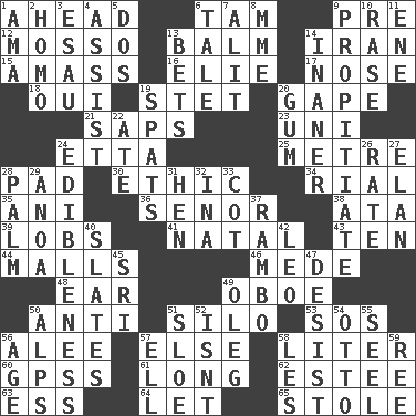 ACROSS 1. Having the leading position 6. Scottish cap 9. Before (prefix) 12. With motion or animation 13. Lip ointment 14. SW Asia republic 15. Collect or gather 16. Writer Wiesel 17. Sense of smell 18. Fr. "Yes" 19. Proofreading order 20. Open wide 21. Plant excrements 23. Corn or form start 24. Singer James 25. Distance measurement (Brit.) 28. Writing tablet 30. Principle of right and wrong 34. Monetary unit of Yemen 35. Black tropical American cuckoo 36. Sir (Sp.) 38. _ moment's notice (2 wds.) 39. Tennis shots 41. Brizilian seaport 43. "___ Little Indians" 44. Shopping centers 46. Ancient Persian 48. Ewer handle 49. Mitch Miller's instrument 50. Against 51. Grain storage tower 53. Distress signal 56. Toward shelter 57. Otherwise 58. 61 cubic inches 60. Global Positioning Systems (abbr.) 61. Protracted 62. First name in cosmetics 63. Double-curved letter 64. Allow 65. Took without asking DOWN 1. Nursemaid (var.) 2. Like (prefix) 3. He sold his birthright 4. Aid 5. Two (Sp.) 6. Lie 7. Came down and settled, as after flight 8. Madame (abbr.) 9. Conciliate 10. Raze (variant) 11. Compass dir. 13. Stakes 14. Sillier 19. Arguments over trivial matters 20. Chewing product 22. Had dinner 24. The property of being fit to eat 26. Assign a rank or rating to 27. Enthusiasm 28. Inside of hand 29. Small Philippine buffalo 31. Layer 32. _ tizzy (2 wds.) 33. Small bed 37. Role for Stallone 40. Chalkboards 42. Lion 45. Indian title of respect (Mr.) 47. Stop 49. Cassini of fashion 50. High mountains 51. A type of plum 52. Is not 54. Von Bismarck 55. Sew up the eyelids of hawks and falcons 56. Ripen 57. Pipe bend 58. French article 59. To riddle