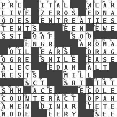 ACROSS 1. Before (prefix) 4. Slanted text style (abbr.) 8. Erode 12. Not recorded 14. Nothings 16. Pulitzer Prize-winning author Ferber 17. Lyric poems 18. Pleas 20. Portable shelters 22. Car or cant ending 23. She-sheep 24. Fast jet (abbr.) 25. Clumsy lout 28. "Barney Miller" actor Jack 30. Engineer (abbr.) 31. Scent 35. Petroleum 37. Hearing organs 40. To trail on the ground 41. Legendary monster 42. Grin 44. Relaxation 45. Actor Baldwin 46. Dutch treat 47. The first octave above the treble staff 48. Musical pauses 50. Place where flour is made 52. _-fi 54. Indian title of respect (Mr.) 55. Make lace 58. Quiet! 61. Adept person 63. Learning spot: Fr. 65. Frustrate 70. Brightly colored fish 71. So be it 72. Middle Eastern gold or silver currency 73. False hair 74. Connecting point 75. Suggestive of the supernatural 76. Perceive with the eye DOWN 1. Secret plans 2. Amusement-park features 3. Happening 4. Ending with capital 5. "___ Little Indians" 6. Tate display 7. Old wives' tales, e.g. 8. Dripping 9. Singer Brickell 10. Afresh 11. To erase 13. Eastern Standard Time (abbr.) 15. Observes 19. Small Philippine buffalo 21. Male child 26. Ripens 27. Movie unit 29. Severe or trying experience 30. Chooses 32. Of the mouth 33. Vertical spar for supporting sails 34. Ripen 35. Stare 36. Angers 38. To free from 39. Criticizes harshly 41. Rowing implement 43. Arab leader 49. Scram! 51. Whopper 53. On the rocks 55. Drinks excessively 56. Having winglike extensions 57. Giggle 58. Examine minutely or intensely 59. Like (prefix) 60. Took on color 62. 4th largest of the Great Lakes 64. Small bed 66. Compass dir. 67. One (Scot) 68. 4-wheeled motor vehicle 69. Attempt