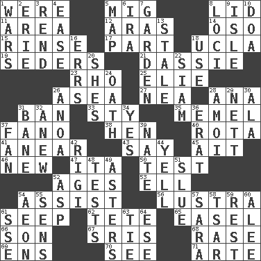 ACROSS 1. Past tense of be (plural) 5. Russian fighter aircraft 8. Hat (slang) 11. Type of rug 12. Ancient river in northeast Turkey 14. Bear (Spanish) 15. Wash lightly 17. Piece 18. Southern CA. univ. 19. Spring feasts 21. Small ungulate mammals of Africa 23. 17th letter of the Greek alphabet 25. Writer Wiesel 26. Toward the sea 27. Teachers' org. 28. Santa ___, CA 31. Bar 33. Filthy place 35. Klaipeda city 37. Papal veil 38. Layer 40. Roll call or roster of names 41. Approach 43. Declare 45. Small island 46. ___ Haven, CT 47. Call ___ day 50. Trial 52. Matures 53. Pipe bend 54. Help 56. A period of five years 61. Ooze 62. Wig 65. Artist's stand 66. Male child 67. Indian titles of respect 68. To erase 69. Followers of ems 70. Perceive with the eye 71. Johnson of "Laugh-In" DOWN 1. Armed conflicts 2. 4th largest of the Great Lakes 3. Tear apart 4. Relaxation 5. Atlas unit 6. Lyricist Gershwin 7. Place where plants grow 8. Locales 9. Capri or Wight 10. ___ good deed 13. Having lost freshness 16. Blunders 18. Purpose 20. "______ My Girl" (Turtles hit) 22. Thailand, formerly 24. Pledge 26. Small Philippine buffalo 28. Mine, in Marseilles 29. Remaining after all deductions 30. Wing 31. Object of repulsion 32. Afresh 34. Consenting reply 36. Part of Q.E.F. 37. Avid follower 39. Nathan's nickname 42. Swiss mountan, "Queen of the Mountains" 44. Shout 48. Trials 49. Michaelmas daisies 51. Turn sharply 52. Viper 54. Age 55. Elected reps. 57. "Two Mules for Sister ____" 58. Russian ruler of old 59. Respite 60. Toward shelter 61. Compass dir. 63. Standoff 64. Compass dir.