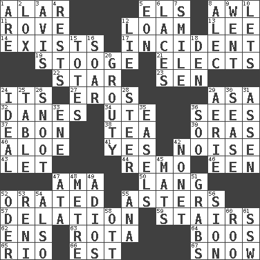 ACROSS 1. Having or resembling wings 5. Raised railways 8. Leather borer 11. Be footloose 12. Rich soil 13. Area sheltered from the wind 14. Is extant 17. Event 19. Moe Howard, for one 21. Chooses 22. Play the lead 23. Elected rep. 24. It is 27. Greek god of love 29. White ___ sheet 32. Natives or inhabitants of Denmark 34. Shoshoni 36. Perceives with the eye 37. Inky black, to poets 38. Afternoon social gathering 39. Mouths or openings 40. _ vera 41. Affirmative reply 42. Annoying sound 43. Allow 44. San ____ (Riviera town) 46. Car or cant ending 47. Housemaid (var.) 50. Austrian-born American filmmaker Fritz 52. Spoke pompously 55. Michaelmas daisies 57. Conveyance 59. Flight of steps 62. Followers of ems 63. Round or rotation of duties 64. Scornful sounds 65. River (Sp.) 66. Eastern Standard Time (abbr.) 67. Overwhelm DOWN 1. "We ___ not amused" (Victoria) 2. Brine-cured salmon 3. Deliberation 4. Musical pauses 5. Period of immesurable duration 6. Shoestrings 7. Grin 8. Actor Baldwin 9. Left 10. Allows 12. Whopper 15. Lugs 16. Fly high 18. Lair 20. Sullen 24. Standard of perfection 25. Eating place 26. Snout, nose 28. Navigate 29. Nest on high 30. Gospel singer Marvin 31. NE Netherlands city 33. Compass dir. 35. Artist's stands 36. "Barney Miller" actor Jack 42. Music written for nine 45. Floor coverings 47. "One Day ___ Time" 48. Distance measurement (Brit.) 49. Goodbye (Sp.) 51. Seizes 52. River in Europe 53. Painter Guido (1575-1642) 54. In addition 55. Santa ___, CA 56. The Jewish people; Israel 58. Baseball player Mel 60. Friend of Pooh 61. Compass dir.