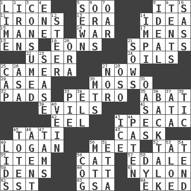ACROSS 1. Louse (plural) 5. "Barney Miller" actor Jack 8. ___ a Wonderful Life 11. Removes the wrinkles 13. Period 14. It may be bright or harebrained 15. French painter Edouard 16. Armed conflict 17. Not women's 18. Followers of ems 19. Immeasurably long periods of time 21. Arguments over trivial matters 22. One who makes use of a thing 24. Petroleums 25. Device for capturing images 27. At this time 29. Toward the sea 30. With motion or animation 32. Groovy apts. 33. Stone: prefix 35. Blind as ____ 39. Vices 41. Suttee (variant) 42. Snakelike fish 43. Medicinal drug used to evoke vomiting 45. Jacques of French films 48. Keg 49. Utah city north of Ogden 50. Rendezvous 52. Make lace 55. A whole individual unit 56. Feline 57. Peak District village in England 59. Cub Scout units 60. Baseball player Mel 61. Thermoplastic polyamide 62. Fast jet (abbr.) 63. Girls' org. (abbr.) 64. Made supply last DOWN 1. Welles in "The Third Man" 2. SW Asia republic 3. Eaten 4. Compass dir. 5. Stitched 6. Mouths or openings 7. Rowing implement 8. Standard of perfection 9. Portable shelters 10. Backtalk 12. Navigate 14. Body of Kaffir warriors 20. Mouth or opening 21. Sty mamas 23. Gospel singer Marvin 25. Head covering 26. White ___ sheet 27. Not either 28. Bear (Spanish) 30. Mountains (abbr.) 31. Fertile tracts in a desert 33. Sliced dessert 34. Pipe bend 36. Sass 37. _ moment's notice (2 wds.) 38. Nervous spasm 40. Distinctive style or manner 43. Frozen water 44. Eucharist need 45. Hauls 46. Representative 47. Scottish caps 49. Hats (slang) 50. Floor protectors 51. Singer James 53. _ vera 54. Be inclined (to) 56. Gear tooth 58. Color