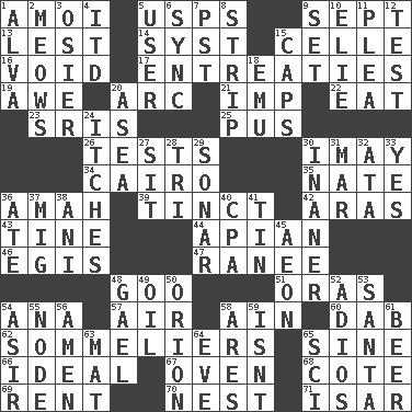 ACROSS 1. Mine, in Marseilles 5. United States Postal Service (abbr.) 9. Back-to-school mo. 13. For fear that 14. System (abbr.) 15. Cell (Danish) 16. Lacking any legal or binding force 17. Pleas 19. Deep reverence 20. Curve 21. Naughty child 22. Ingest 23. Indian titles of respect 25. Fluid product of inflammation 26. Trials 30. "If ____ say so..." 34. Capital of Egypt 35. Nathan's nickname 36. Nursemaid 39. Colored lightly or faintly 42. Caspian sea tributary 43. Prong on a fork 44. Bee-related 46. Armor plate that protects the chest 47. The wife of a rajah (variant) 48. Thick or sticky substance 51. Mouths or openings 54. Santa ___, CA 57. Wind 58. The 18th letter of the Arabic alphabet 60. Small moist lump or mass 62. Wine waiters 65. Trig term 66. Standard of perfection 67. Baking chamber 68. ____ d'Azur (French Riviera) 69. Monthly bill 70. Egg locale 71. Austrian river, tributary to the Danube DOWN 1. Inventor's middle name 2. Catcalls? 3. Flexible twig of a willow tree 4. It would 5. One who makes use of a thing 6. Synchronize (abbr.) 7. Pacific Standard Time (abbr.) 8. Empty completely 9. Put into a specified state 10. Writer Wiesel 11. Entreaty 12. Trial 15. Balmoral and tarboosh 18. Australian flightless bird 20. Toward the sea 24. Skin irritations 27. Be seated 28. Three (prefix) 29. Echolocation 30. Sillier 31. Spoil 32. _ moment's notice (2 wds.) 33. Affirmative reply 36. Had dinner 37. Russian fighter aircraft 38. Black tropical American cuckoo 40. Tax preparer (abbr.) 41. Metal container 45. Age 48. Highlander 49. Lubricate 50. Greek mythologigal hunter 52. Goodbye (Sp.) 53. Before Barbara or Clara 54. SW Saudi Arabia district 55. Thickened enlargement 56. So be it 58. Ancient Greek god of war 59. Is not 61. Fermented drink made from hops 63. Floor protector 64. First lady 65. _-fi