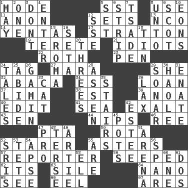 ACROSS 1. Method 5. Fast jet (abbr.) 8. Purpose 11. At once, immediately (arch.) 12. Puts into a specified state 13. Non-commissioned officer (abbr.) 14. Gossips 17. Ski resort town in Vermont 19. Cylindrical with tapered ends 21. Foolish or stupid persons 22. Writer of Portnoy's Complaint (1969) 23. Writing instrument 24. Label 27. Hindu Mythology: god of death 29. A female animal or person 32. Phillipine bananalike plant 34. Curvy letter 36. Grant temporary use of 37. Pale green bean 38. Eastern Standard Time (abbr.) 39. Small Philippine buffalo 40. Prepare for publication 41. Ocean 42. Glorify 43. Elected rep. 44. Cuts off 46. To riddle 47. Parent Teacher Association (abbr.) 50. Round or rotation of duties 52. A viewer who gazes fixedly 55. Michaelmas daisies 57. Newsperson 59. Oozed 62. ___ a Wonderful Life 63. Filth; sediment 64. Billionth: prefix 65. Observe 66. Snakelike fish 67. Ancient Greek god of war DOWN 1. Can I? 2. Single 3. Do not 4. Keyboard key 5. Put into a specified state 6. Long narrow piece of something 7. Sadhe (variant) 8. To (old English) 9. Highlander 10. Immeasurably long periods of time 12. Compass dir. 15. Scent 16. Stalk of a moss capsule 18. Shallow baking pan 20. Trios 24. Stories 25. Tolerate 26. Street urchin 28. NE Netherlands city 29. Underwater navigation system 30. White Person, in Hawaii 31. Maternal 33. Domesticated feline 35. Flight of steps 36. Not strict 42. First name in cosmetics 45. Plant holders 47. Adept person 48. Laconic 49. Nick name for Arthur 51. Sports stadium 52. Indian titles of respect 53. Wig 54. Domed church section 55. "We ___ not amused" (Victoria) 56. Coast Guard woman 58. Pipe bend 60. Compass dir. 61. Two (Sp.)