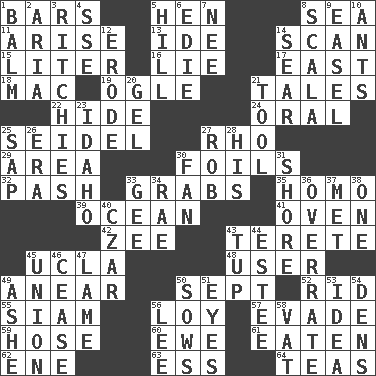 ACROSS 1. Drinking establishments 5. Layer 8. Ocean 11. Originate 13. Binary compound 14. Glance over 15. 61 cubic inches 16. Untruth 17. Compass direction 18. Big _ 19. Stare 21. Lies 22. Flintstone garb 24. Taken by mouth 25. A glass for beer 27. 17th letter of the Greek alphabet 29. Type of rug 30. Fencing necessities 32. Romantic infatuation 33. Takes hold of 35. Same (prefix) 39. Sea 41. Baking chamber 42. Last letter of the English alphabet 43. Cylindrical with tapered ends 45. Southern CA. univ. 48. One who uses or employs something 49. Approach 50. Back-to-school mo. 52. To free from 55. Thailand, formerly 56. Myrna of the movies 57. Elude 59. Flexible conduit 60. She-sheep 61. Eroded 62. Compass dir. 63. Double-curved letter 64. Afternoon social gatherings DOWN 1. Lip ointment 2. Operatic vocal solo 3. Actors Guy, Robert Welles, and Clint 4. Compass dir. 5. Land elevation 6. Singer Brickell 7. Born 8. Any of the three canals of the cochlea 9. Artist's stand 10. Pismires 12. Wear away 14. Shrivel 20. Set 21. Utensil 23. Potato state 25. Plant excrement 26. Period 27. Director Reiner 28. Part of HMS, perhaps 30. Avid follower 31. Dinah or Pauly 33. Unit of force equal to gravity 34. Actress Charlotte 36. Make much ado about nothing 37. Was introduced to 38. Single 40. Russian ruler of old 43. Uncastrated adult male sheep 44. First name in cosmetics 45. The state of being joined or united 46. Desist 47. Unable to walk 49. American tennis player Robert 50. Sty mamas 51. Snake ____ (dice throw) 53. The main thing one is thinking about 54. Lairs 56. Area sheltered from the wind 58. Large container