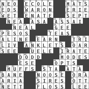 ACROSS 1. Modern: prefix 4. Learning spot: Fr. 9. Floor coverings 13. Begley and Asner 14. Make _____ (do battle with) 15. 4th largest of the Great Lakes 16. Dripping 17. Maternal 18. Back-to-school mo. 19. Teachers' org. 21. White ___ sheet 22. Slender Brazilian palm 24. Be tempered by heat 26. Turn to the right 27. Mexican monetary units 29. Beverages made from leaves 30. Place in a line 31. Merit 33. Three (prefix) 36. 54 in ancient Rome 37. Short socks 40. Boat paddle 41. Observe 42. Ubangi River tributary 43. Feeling or showing extreme anger 45. Texas town _ City 47. Methods 48. Compass dir. 49. Elects 50. Bungles 52. R.R. building 54. "One Day ___ Time" 56. Object of repulsion 57. Trap for birds or small mammals 59. Mouth or opening 61. Operatic vocal solo 62. Fathers 63. Baseball player Mel 64. Remaining after all deductions 65. Soft thread for cleaning between teeth 66. Area sheltered from the wind DOWN 1. ___ Haven, CT 2. Paradise 3. Clearly or manifestly demonstrative 4. She-sheep 5. Lessep's creation 6. Mouths or openings 7. Globular water bottle used in Asia 8. Compass dir. 9. Makes clutter 10. Type of rug 11. Native american tent (variation) 12. Arrange properly for use 20. Age 22. Rep 23. Ocean 25. At sea 27. Friends 28. Writer Wiesel 29. Woody plant 31. Made supply last 32. Everything 33. Inedible or poisonous agaric 34. Assign a rank or rating to 35. Angers 38. Unclothed pictures 39. Simple or foolish person 44. Round or rotation of duties 45. Outscore 46. Order of Saint Francis (abbr.) 49. Fertile tracts in a desert 50. Female horse 51. A single undivided whole 52. Land 53. "Corrida" creature 55. Johnson of "Laugh-In" 56. Bar 57. Science/research agcy. 58. Curvy letter 60. Had dinner