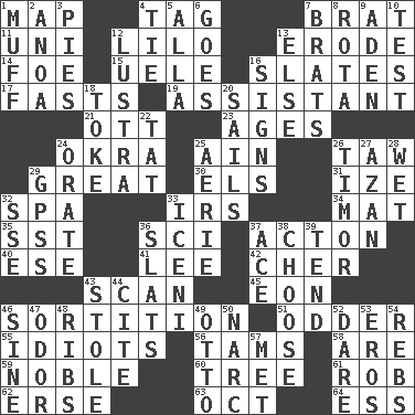 ACROSS 1. Atlas unit 4. Label 7. Naughty child 11. University (slang) 12. _ and Stitch 13. Eat (away) 14. Enemy 15. Ubangi River tributary 16. Chalkboards 17. Goes without food and/or water 19. Aide 21. Baseball player Mel 23. Eons 24. Gumbo ingredient 25. The 18th letter of the Arabic alphabet 26. The 23rd letter of the Hebrew alphabet 29. Relatively large 30. Raised railways 31. Ending with capital 32. Health resort 33. Big collection agency 34. Floor covering 35. Fast jet (abbr.) 36. _-fi 37. Gambison 40. Compass dir. 41. Area sheltered from the wind 42. "Mermaids" star 43. Examine minutely or intensely 45. A really long time 46. Casting lots 51. More peculiar 55. Foolish or stupid persons 56. Scottish caps 58. "We ___ not amused" (Victoria) 59. Having high moral qualities 60. Family _ (genealogy) 61. Director Reiner 62. Celtic language 63. Sep. follower 64. Curvy letter DOWN 1. Perform or handle clumsily 2. Small Philippine buffalo 3. Sliced desserts 4. Make a knot 5. Silent film actress Nazimova 6. Moves 7. Naughty children 8. Round or rotation of duties 9. An important port of Yemen 10. Trial 12. A period of five years 13. Otherwise 16. Public displays of written messages 18. Puff or smoke 20. Moves on water 22. Make lace 24. Declaim 25. Nest on high 26. The easternmost of the Lesser Sundas 27. Muslim summons to prayer 28. Soggy 29. Global Positioning Systems (abbr.) 32. Compass dir. 33. Ancient Celtic tribe of eastern Britain 36. Narrow boards 37. Adept person 38. Elect 39. Look after 43. Fur scarf 44. Quote 46. Trig term 47. Scent 48. Chest bones 49. Von Bismarck 50. Drug cop 52. Have the gumption 53. Greek god of love 54. Confederate soldiers (slang) 57. Was introduced to