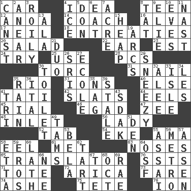 ACROSS 1. Automobile 4. The main thing one is thinking about 8. Adolescent 12. Small Philippine buffalo 14. Team commander 16. Inventor's middle name 17. Famous astronaut Armstrong 18. Pleas 20. Vegetable dish 22. Ewer handle 23. Eastern Standard Time (abbr.) 24. Attempt to accomplish something 25. Purpose 28. Personal Computers (abbr.) 30. Torque (variant) 31. Slow-paced one 35. River (Sp.) 37. Charged particles 40. Otherwise 41. Jacques of French films 42. Narrow boards 44. Snakelike fish 45. Monetary unit of Yemen 46. Mild oath 47. Last letter of the English alphabet 48. An arm off of a larger body of water 50. Kenny Rogers chart-topper in '80 52. Keyboard key 54. Make supply last 55. Nursemaid (var.) 58. Snakelike fish 61. Was introduced to 63. Olfactory organs 65. Interpreter 70. Fast planes 71. Carry 72. N. Chile seaport 73. Conductor's collection 74. American tennis player Robert 75. False hair 76. Electrically charged atom DOWN 1. 2nd pers. sing. pres. of can (arch.) 2. Approach 3. Agitated, as a liquid 4. Frozen water 5. Spanish title 6. Erode 7. 1/640 square mile 8. Make lace 9. Writer Wiesel 10. Nights before holidays 11. Political cartoonist Thomas 13. Wing 15. Pile 19. Curves 21. Superhero pair 26. Indian titles of respect 27. Learning spot: Fr. 29. Dwarf with a sinus problem 30. Bathroom plumbing fixture 32. Toward shelter 33. Capri or Wight 34. French article 35. Precipitation 36. Slanted text style (abbr.) 38. Tired old horse 39. Showing deterioration from age 41. Three (prefix) 43. Neighbor of Neb. 49. Scottish caps 51. Lair 53. Actor Lugosi 55. Slender Brazilian palm 56. Paris' subway 57. NE Netherlands city 58. Singer James 59. Greek god of love 60. Thin strip of wood or metal 62. Small pie 64. Order of Saint Francis (abbr.) 66. Born 67. Neckwear 68. Sep. follower 69. Actress Charlotte