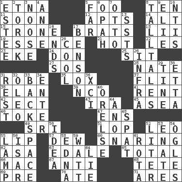 ACROSS 1. Inactive volcano in Sicily 5. Egg _ yung 8. Nine, plus one 11. Within a short period 12. Tenement units (abbr.) 14. Keyboard modifier key 15. Heavy duty weighing machine 17. Naughty children 18. Cards in a Roman deck? 19. Center 21. Being at a high temperature 22. French article 23. Supplement with great effort 24. Spanish title 25. Be seated 27. Mayday 28. Nathan's nickname 31. Loose flowing garment 35. Brine-cured salmon 37. Sudden quick movement 38. Liveliness 39. Non-commissioned officer (abbr.) 41. Monthly bill 42. Religious group 43. Retirement account (abbr.) 45. At sea 46. Casino tip 47. Followers of ems 49. Indian title of respect (Mr.) 51. Chop off 52. Lion 55. Mouth edge 57. Morning condensation 60. Catching in a trap 62. White ___ sheet 63. Peak District village in England 65. "_____ Recall" 66. Apple computer (short form) 67. Opposed to 68. Wig 69. Before (prefix) 70. Had dinner 71. Ancient Greek god of war DOWN 1. First name in cosmetics 2. Cod relative 3. Trap for birds or small mammals 4. Queen of England 1702-14 5. At a great distance 6. Brightly colored fish 7. "Beetle Bailey" pooch 8. Baron Munchausen's specialties 9. Writer Wiesel 10. Nuclear Threat Initiatives 13. Fast planes 16. Extremities 17. Gillaume's butler role 20. Calm and collected 26. Kind of red light 29. Prong on a fork 30. Singer James 31. Repose 32. Margarine 33. Keyboard key 34. Keyboard key 36. One more than ninety 40. Threatening words 44. Soon (poet.) 48. Argument over a trivial matter 50. It may be bright or harebrained 52. 61 cubic inches 53. Maternal 54. Stares 55. Desk light 56. Austrian river, tributary to the Danube 58. Pulitzer Prize-winning author Ferber 59. Electrical Unit 61. Round or rotation of duties 64. Falsehood