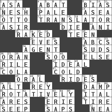 ACROSS 1. White ___ sheet 4. Blind as ____ 8. Prejudice 12. Soft 14. Diluted with white 15. Toward the sea 16. "Beetle Bailey" pooch 17. Interpreter 20. SW Saudi Arabia district 21. Pass on 22. Cuckoo 23. Swept the length of 27. Adolescent 29. Nights before holidays 31. Lettered men learn these first 34. Representative 35. Beer foam 36. NW Algerian seaport 39. "Barney Miller" actor Jack 41. Otherwise 42. Cause heat under the collar 43. Standard of perfection 46. Root beer relative 47. Lacking warmth 48. Of the mouth 51. Amusement-park features 54. The first octave above the treble staff 56. Marina Del _, California 58. Moist 61. Producing rotation 66. Slanted text style (abbr.) 67. Ancient Greek god of war 68. One of the Great Lakes 69. Hoop that covers a wheel 70. Ooze 71. Plant excrements 72. Teachers' org. DOWN 1. Small Philippine buffalo 2. Arranges properly for use 3. Moving or stirring 4. Fitting 5. Soap unit 6. Wing 7. Watch over 8. Sound made by sheep 9. Byzantium, centuries later 10. Period of immesurable duration 11. Indian skirt 13. Israeli folk dance 18. Be seated 19. Area sheltered from the wind 24. Cask 25. First lady 26. Hiding places for outlaws 28. Artist's stand 30. Unemotional 32. Music discs 33. Compass dir. 34. Approach 36. The grampus (Milton) 37. _ de Janeiro 38. One to whom something is allotted 40. Aroma 44. Connecticut Ivy Leaguer 45. Find the sum of 49. Nonscientific branch of learning 50. Flowery wreath 52. Prepare for publication 53. Smooth fabric 54. Ancient river in northeast Turkey 55. Old wives' tales, e.g. 57. Jacques Cousteau's middle name 59. Female horse 60. Entreaty 62. Viper 63. Period 64. Mouth edge 65. Consenting reply