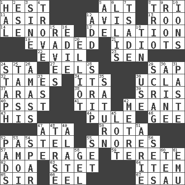 ACROSS 1. Behest 5. The first octave above the treble staff 8. Three (prefix) 11. SW Saudi Arabia district 12. Deliberation 13. Friend of Pooh 14. Poe poem 17. Conveyance 19. Dodged 21. Foolish or stupid persons 22. Morally bad or wrong 23. Elected rep. 24. R.R. building 27. Snakelike fish 29. Plant excrement 32. Corrects by punishment or discipline 34. It is 36. Southern CA. univ. 37. Ancient river in northeast Turkey 38. Mouth or opening 39. Indian titles of respect 40. Inconspicuous attention getter 41. Teat (slang) 42. Intended 43. Part of HMS, perhaps 44. Whimper 46. Unit of force equal to gravity 47. _ moment's notice (2 wds.) 50. Roll call or roster of names 52. Soft color 55. Sounds asleep 57. Electrical Measurement 59. Cylindrical with tapered ends 62. ___ good deed 63. Proofreading order 64. Detail 65. Title for a knight 66. Snakelike fish 67. Son of Isaac DOWN 1. Actor Linden 2. Compass dir. 3. Trig term 4. Collection of objects 5. "___ Maria" 6. Ms. Damita and namesakes 7. Sadhe (variant) 8. Musical group of three 9. Carrot, for example 10. Charged atoms 12. Find the sum of 15. All-night dance parties 16. Singer Brickell 18. Metal container 20. American author Paul (1891-1958) 24. Staphylococcus 25. Tarsus (plural) 26. Collect or gather 28. Remove all contents or possession from 29. Strangle with an iron collar 30. Place in a line 31. Thick mixture 33. Eastern Standard Time (abbr.) 35. Titan orbits this 36. Purpose 42. Distance measurement (Brit.) 45. Plunder 47. Had dinner 48. Laconic 49. Having winglike extensions 51. Nest on high 52. Groovy apts. 53. Mine, in Marseilles 54. Practice fight 55. Arrange properly for use 56. Arranges properly for use 58. Set 60. Beverage made from leaves 61. Australian flightless bird