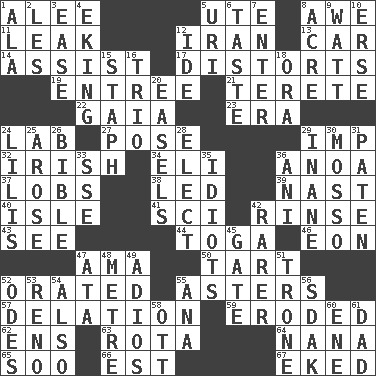 ACROSS 1. Toward shelter 5. Shoshoni 8. Deep reverence 11. Path through which fluid escapes 12. SW Asia republic 13. Auto 14. Aid 17. What propaganda does 19. Main course 21. Cigar-shaped 22. Greek goddess of the earth (variant) 23. Epoch 24. Experiment locale 27. Introduce or present, as a question 29. Mischievous child 32. From or relating to Ireland 34. Biblical high priest 36. Small Philippine buffalo 37. Tennis shots 38. Directed 39. Political cartoonist Thomas 40. Small island 41. _-fi 42. Wash lightly 43. Perceive with the eye 44. Ancient Roman robe 46. Period of immesurable duration 47. Wet nurse (var.) 50. Small pie 52. Spoke pompously 55. Michaelmas daisies 57. Accusation by an informer 59. Worn away 62. Followers of ems 63. Roll call or roster of names 64. Grandmother 65. "Barney Miller" actor Jack 66. Eastern Standard Time (abbr.) 67. Supplemented with great effort DOWN 1. In the manner of 2. French article 3. Comfort 4. Supplementing with great effort 5. RI univ. 6. Clothes sense 7. Keyboard key 8. Measure of real estate 9. Electrical Unit 10. Celtic language 12. Binary compound 15. Staphylococcus 16. Musical group of three 18. Mouth or opening 20. Artist's stands 24. Ms. Damita and namesakes 25. Came up 26. God's Word 28. Opt 29. Lacking in sense or substance 30. With motion or animation 31. Eucharist need 33. Compass dir. 35. Foolish or stupid persons 36. Cuckoo 42. More uncommon 45. Yard entry 47. _ moment's notice (2 wds.) 48. Distance measurement (Brit.) 49. Goodbye (Sp.) 51. Heavy duty weighing machine 52. Lyric poems 53. Western Nevada city 54. In addition 55. Santa ___, CA 56. Neighbor of Neb. 58. Baseball player Mel 60. Compass dir. 61. Male parent