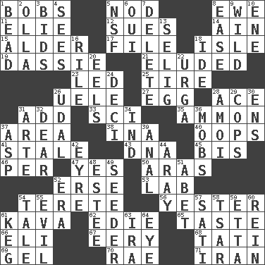 ACROSS 1. Moves up and down 5. Dreamland 8. She-sheep 11. Writer Wiesel 12. Institutes legal proceedings 14. The 18th letter of the Arabic alphabet 15. Tree or shrub in the Birch family 17. Do some clerical work 18. Capri or Wight 19. Hyrax 21. Evaded 23. Directed 25. Hoop that covers a wheel 26. Ubangi River tributary 27. Ovum 28. Adept person 31. Say or write further 33. _-fi 35. ID or VA city 37. Type of rug 38. _ tizzy (2 wds.) 40. I made a mistake 41. Having lost freshness 43. Heredity factor (abbr.) 45. Altar cloth linen 46. For each 47. Consenting reply 50. Ancient river in northeast Turkey 52. Celtic language 53. Experiment locale 54. Cylindrical with tapered ends 56. Next before 61. Polynesian shrub of the pepper family 62. Singer Brickell 65. Clothes sense 66. Connecticut Ivy Leaguer 67. Suggestive of the supernatural 68. Jacques of French films 69. Set 70. Actress Charlotte 71. SW Asia republic DOWN 1. Necklace unit 2. Water jar 3. Auction offers 4. Observes 5. Overdraft (abbr.) 6. Fr. "Yes" 7. Keyboard key 8. Comfort 9. Rampant 10. Compass dir. 13. Major League Baseball Commissioner Bud 16. Cause heat under the collar 18. Binary compound 20. Snakelike fish 22. Capital and largest city of Mongolia 24. Tenth: prefix 26. Hereditary estate 28. Mine, in Marseilles 29. 911 reaches them 30. Followers of ems 31. Johnson of "Laugh-In" 32. Letter starter 34. Indiana (abbr.) 36. Crowds into 37. Viper 39. Of or related to the anus 42. Jane of fiction 44. Like ___ of sunshine 48. First name in cosmetics 49. Sowing specialist 51. Collude with 52. Epoch 54. Lie 55. Morally bad or wrong 57. Suttee (variant) 58. Russian ruler of old 59. Singer James 60. It's straight from the horse's mouth 61. Cask 63. Lyricist Gershwin 64. Sight organ