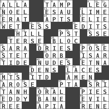 ACROSS 1. Silent film actress Nazimova 5. Pack (down) 9. Part of a journey 12. Christmas carol 13. Son of Isaac 14. Welles in "The Third Man" 15. Part of Q.E.F. 16. Flats, for short 17. Writer Wiesel 18. Soggy 19. Double-curved letter 21. Prepares for publication 22. Land elevation 24. Pacific Standard Time (abbr.) 26. Compass dir. 27. Laconic 28. Coalition 29. "Two Mules for Sister ____" 30. Frees from moisture 32. Airs 36. Proofreading order 37. Globe 38. Austrian river, tributary to the Danube 39. Event that recurs at intervals 40. Unadorned figures 42. Inactive volcano in Sicily 43. Lairs 44. Shoestrings 46. Mountains (abbr.) 49. It would 50. So be it 51. Came up 53. Parent Teacher Association (abbr.) 54. _ Lanka 57. Hyperbolic tangent 58. Taken by mouth 61. Sliced desserts 62. Whirlpool 63. Object of repulsion 64. Morally bad or wrong 65. To sift 66. Capital of Western Samoa 67. French philosopher Descartes DOWN 1. Afresh 2. Old wives' tales, e.g. 3. Resembling or made to resemble leather 4. Keyboard modifier key 5. Beverages made from leaves 6. Cleo's killer 7. Floor covering 8. Tenth month of the Hindu calendar 9. Ms. Damita and namesakes 10. Sends forth 11. Honkers 14. Directed 19. Raised railways 20. Downhill vehicle 21. And so on (abbr.) 23. Feeling or showing extreme anger 24. First-year military academy student 25. Mayday 27. Jacques of French films 28. Avian creatures 29. Fast jet (abbr.) 31. One shot 32. Component 33. Clearly or manifestly demonstrative 34. Without 35. Period 40. Fish or hair follower 41. Narrow board 43. Pass on 45. Wet nurse (var.) 46. Mother 47. Buy and sell 48. Message 52. Like a shrinking violet 53. Entreaty 55. It's straight from the horse's mouth 56. Capri or Wight 58. Chief or king in Benin or Nigeria 59. Reproach for some lapse or misdeed 60. Black tropical American cuckoo 61. For each