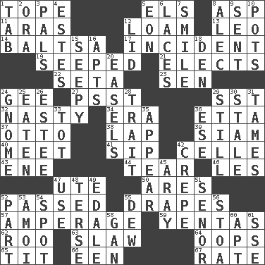 ACROSS 1. Drink excessively 5. Raised railways 8. Viper 11. Ancient river in northeast Turkey 12. Rich soil 13. Lion 14. Greek mezzo-soprano Agnes 17. Happening 19. Oozed 21. Opts 22. Bristle 23. Elected rep. 24. Unit of force equal to gravity 27. Inconspicuous attention getter 29. Fast jet (abbr.) 32. Offensive 34. Epoch 36. Singer James 37. "Beetle Bailey" pooch 38. Pet locale 39. Thailand, formerly 40. Rendezvous 41. Small drink 42. Cell (Danish) 43. Compass dir. 44. Separate forcefully 46. French article 47. Shoshoni 50. Ancient Greek god of war 52. Went by 55. Window treatments 57. Electrical Measurement 59. Gossips 62. Friend of Pooh 63. Cole _ (cabbage dish) 64. I made a mistake 65. Teat (slang) 66. Car or cant ending 67. Pace DOWN 1. Bar bill 2. Mouth or opening 3. Friends 4. _____ Park, CO 5. Age 6. Shoestrings 7. Grin 8. Actor Baldwin 9. Emitted 10. Plant holders 12. Hat (slang) 15. Oozy 16. Tenement units (abbr.) 18. Lair 20. Artist's stands 24. Dwarf 25. Eroded 26. First name in cosmetics 28. Distinguishing feature 29. Free from disturbance or agitation 30. Lacking originality or spontaneity 31. Domesticates 33. Small child 35. Seem 36. Compass dir. 42. Streamer paper 45. Like ___ of sunshine 47. Purpose 48. Laconic 49. Peak District village in England 51. Sir (Sp.) 52. Role in a play 53. Mine, in Marseilles 54. Specific locale 55. Morning condensation 56. Portico 58. Separate the seeds from cotton 60. Fitting 61. Compass dir.