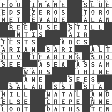 ACROSS 1. Egg _ yung 4. Empty; void 9. Change direction abruptly 13. Begley and Asner 14. Nothings 15. "Corrida" creature 16. Was introduced to 17. Elude 18. ____ Jay Lerner 19. To separate or throw off 21. Purpose 22. Free of sound 24. Nuclear Threat Initiatives 26. Atmosphere 27. Trials 29. Lettered men learn these first 30. Believer in; advocate of (suffix) 31. Indian skirt 33. The first octave above the treble staff 36. HTML Container Element 37. Lacerating 40. "Barney Miller" actor Jack 41. Perceive with the eye 42. Toward the sea 43. Indian state 45. Armed conflicts 47. One or ones belonging to thee 48. A saturated hydrocarbon 49. Observes 50. First course 52. Fast jet (abbr.) 54. R.R. building 56. Place where flour is made 57. Relating to or accompanying birth 59. Also 61. Otherwise 62. Streamer paper 63. Compass dir. 64. Plunder 65. Curses 66. "___ Little Indians" DOWN 1. Opposite of masc. 2. Baltic tributary 3. Clearly or manifestly demonstrative 4. Ending with capital 5. Congenital growth or mark on the skin 6. Caspian sea tributary 7. Connecting point 8. Compass dir. 9. Flight of steps 10. Hang loosely or laxly 11. Mountain range 12. A really long time 20. Singer James 22. Unit of acoustic absorption 23. Nervous spasm 25. Is not 27. Bits 28. One of the Great Lakes 29. Operatic vocal solo 31. Backtalk 32. "We ___ not amused" (Victoria) 33. Helper 34. Grant temporary use of 35. Heavy book 38. Having ears or earlike features 39. Yard entry 44. "______ My Girl" (Turtles hit) 45. Place for singles 46. Santa ___, CA 49. Staphylococcus 50. Grain storage tower 51. In addition 52. "Two Mules for Sister ____" 53. Proofreading order 55. Queen of England 1702-14 56. Cartoonist voice _ Blanc 57. Non-commissioned officer (abbr.) 58. French article 60. Lair