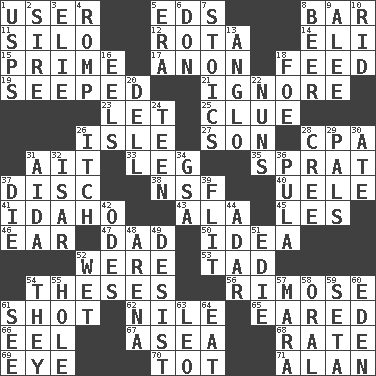 ACROSS 1. One who makes use of a thing 5. Begley and Asner 8. Drinking establishment 11. Grain storage tower 12. Roll call or roster of names 14. Connecticut Ivy Leaguer 15. A-one 17. Soon (poet.) 18. Nourish 19. Oozed 21. Snub 23. Allow 25. A slight indication 26. Capri or Wight 27. Boy, to dad 28. Accounting whiz (abbr.) 31. Small island 33. Part of a journey 35. Small fatty European fish 37. Flat circle 38. Overdraft (abbr.) 40. Ubangi River tributary 41. Potato state 43. Chicken ___ king 45. French article 46. Ewer handle 47. June honoree 50. It may be bright or harebrained 52. Past tense of be (plural) 53. Small boy 54. College papers 56. Full of chinks, cracks, or crevices 61. Attempt 62. "Death on the ____" 65. Having ears or earlike features 66. Snakelike fish 67. At sea 68. Assign a rank or rating to 69. Sight organ 70. Small child 71. ____ Jay Lerner DOWN 1. United States Postal Service (abbr.) 2. Beget 3. Writer Wiesel 4. Frolic 5. Period 6. Spanish title 7. Unemotional ones 8. Fermented drink made from hops 9. Toward shelter 10. To free from 13. White American of non-Hispanic descent 16. Snakelike fish 18. Enemy 20. Small valley 22. Religious women 24. Adolescent 26. Hankering 28. Algonquian 29. Friends 30. Had dinner 31. Opera by Verdi 32. Austrian river, tributary to the Danube 34. Girls' org. (abbr.) 36. Monetary unit of Botswana 37. Pass on 39. Secret move to avoid paying debts 42. Lyric poems 44. The sixth month of the Jewish calendar 48. Sports stadium 49. Stop 51. Singer Brickell 52. Dripping 54. Those people 55. Hollow 57. Hindu Mythology: god of death 58. Spoken 59. Bristle 60. Genesis locale 61. Perceive with the eye 63. Lion 64. Consume
