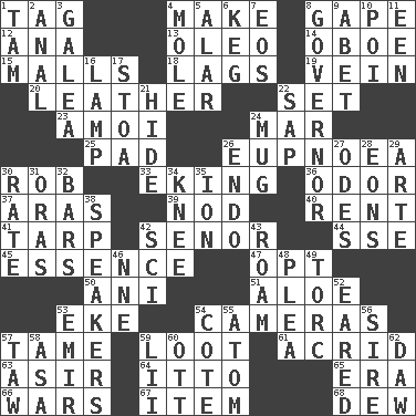 ACROSS 1. Label 4. Create 8. Open wide 12. Santa ___, CA 13. Margarine 14. Mitch Miller's instrument 15. Promenades 18. Falls behind 19. Distinctive style or manner 20. Cordwainer's material 22. Arrange properly for use 23. Mine, in Marseilles 24. Impair 25. Groovy apt. 26. Normal relaxed breathing 30. Director Reiner 33. Supplementing with great effort 36. Aroma 37. Ancient river in northeast Turkey 39. Dreamland 40. Monthly bill 41. Canvas cover 42. Sir (Sp.) 44. Compass dir. 45. Substance 47. Choose 50. Black tropical American cuckoo 51. Medicinal plant 53. Make supply last 54. Devices for capturing images 57. Not wild 59. Spoils 61. Sour-tasting 63. SW Saudi Arabia district 64. "Tell ____ the Marines!" 65. Epoch 66. Armed conflicts 67. A whole individual unit 68. Morning condensation DOWN 1. Scottish cap 2. Of or related to the anus 3. An organ shaped like a helmet 4. Undercover agent 5. Having or resembling wings 6. Barrel 7. Greek goddess of the dawn 8. State head 9. Collude with 10. Luau course 11. Car or cant ending 16. Desk light 17. Portico 21. Flintstone garb 22. Plant excrement 24. Large cup 26. Inside; within (prefix) 27. Lyric poems 28. Immeasurably long periods of time 29. Johnson of "Laugh-In" 30. Assign a rank or rating to 31. Mouths or openings 32. Taverns 34. Leg joint 35. Electrically charged atom 38. Orators 42. _-fi 43. Wander 46. Compass dir. 48. Entreaty 49. Torque (variant) 52. Having ears or earlike features 53. Independent ruler or chieftain 54. ____ d'Azur (French Riviera) 55. Smallest unit of an element 56. Title for a man of rank and authority 57. The 23rd letter of the Hebrew alphabet 58. White ___ sheet 59. Cards in a Roman deck? 60. Baseball player Mel 62. Fool