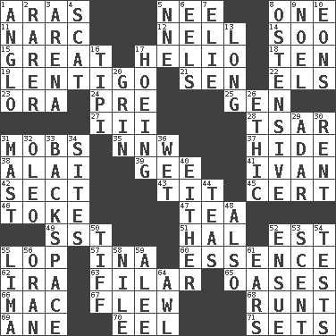 ACROSS 1. Caspian sea tributary 5. Born 8. Single 11. Drug cop 12. 1994 drama film starring Jodie Foster 14. "Barney Miller" actor Jack 15. Relatively large 17. Sun: prefix 18. Nine, plus one 19. Small, flat, pigmented spot on the skin 21. Elected rep. 22. Raised railways 23. Mouth or opening 24. Before (prefix) 25. Commissioned mil. rank 27. One more than two 28. Russian ruler of old 31. Disorderly crowds 35. Compass dir. 37. Flintstone garb 38. Jai ____ 39. Unit of force equal to gravity 41. "Terrible" tsar 42. Religious group 43. Teat (slang) 45. Sure thing 46. Casino tip 47. Beverage made from leaves 49. Fast jet (abbr.) 51. Actor Linden 52. Eastern Standard Time (abbr.) 55. Trim (branches) 57. _ tizzy (2 wds.) 60. Center 62. Retirement account (abbr.) 63. Of or pertaining to a thread or threads 65. Fertile tracts in a desert 66. Apple computer (short form) 67. Soared 68. Undersized animal 69. A saturated hydrocarbon 70. Snakelike fish 71. Arranges properly for use DOWN 1. White American of non-Hispanic descent 2. Less widely known 3. Sports stadium 4. Leave at once 5. Compass dir. 6. Snakelike fish 7. Writer Wiesel 8. Clearly or manifestly demonstrative 9. Christmas carol 10. Immeasurably long periods of time 13. Protracted 16. Native american tent (variation) 17. Weeding 20. Broad smile 26. Principle of right and wrong 29. The sixth month of the Jewish calendar 30. Monthly bill 31. Vertical spar for supporting sails 32. Margarine 33. Keyboard key 34. Locates 36. Soggy 40. One or the other of two 44. Beverages made from leaves 48. In addition 50. Small quarrel 52. Take place subsequently 53. Aroma 54. Trials 55. Pale green bean 56. Northwest Algerian city 58. Mediterranean tributary 59. Toward shelter 61. Hearing organs 64. Leather borer