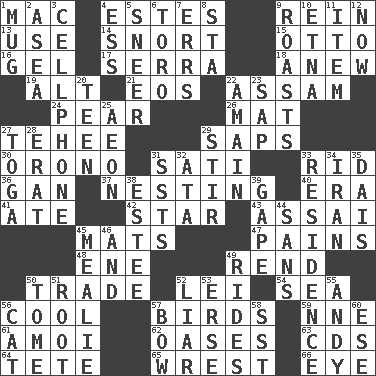 ACROSS 1. Apple computer (short form) 4. _____ Park, CO 9. It's straight from the horse's mouth 13. Purpose 14. Derisive sound 15. Von Bismarck 16. Set 17. Father Junipero _ 18. Afresh 19. Keyboard modifier key 21. Greek goddess of the dawn 22. Indian state 24. Lightbulb-shaped fruit 26. Floor covering 27. Giggle 29. Plant excrements 30. U. of Maine site 31. Suttee (variant) 33. To free from 36. Separate the seeds from cotton 37. Snuggling 40. Epoch 41. Had dinner 42. Play the lead 43. Slender Brazilian palm 45. Floor coverings 47. Aches 48. Compass dir. 49. Tear apart 50. Swap 52. Flowery wreath 54. Ocean 56. Calm and collected 57. Avian creatures 59. Compass dir. 61. Mine, in Marseilles 62. Fertile tracts in a desert 63. Music discs 64. False hair 65. Take or capture by force 66. Sight organ DOWN 1. Large cup 2. Toward the sea 3. Portable communications device 4. Double-curved letter 5. Contemptuous expression 6. "Corrida" creature 7. Blunders 8. R.R. building 9. Ridicules or criticizes harshly 10. Inactive volcano in Sicily 11. A whole individual unit 12. Immediately 20. Adolescent 22. With great haste 23. Plant excrement 25. Age 27. Ancient Roman robe 28. Part of Q.E.F. 29. Move through with a circular motion 31. Fast planes 32. "One Day ___ Time" 33. Home 34. SW Asia republic 35. Raised platform 38. First name in cosmetics 39. Open wide 44. Without 45. Ear of corn 46. Also 49. Amusement-park features 50. Heavy book 51. Carrot, for example 52. One who doesn't tell the truth 53. Celtic language 55. Actor Griffith 56. Feline 57. Ribbon knot 58. Fast jet (abbr.) 60. Compass dir.