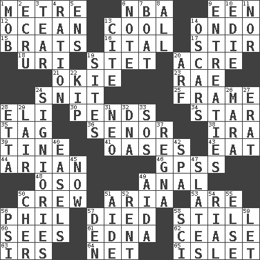 ACROSS 1. Distance measurement (Brit.) 6. Basketball assoc. 9. Car or cant ending 12. Sea 13. Calm and collected 14. Southwest Nigerian state 15. Naughty children 16. Slanted text style (abbr.) 17. Move through with a circular motion 18. RI univ. 19. Proofreading order 20. 43,560 square feet 21. Migrant worker of the '30s 23. Actress Charlotte 24. In a ____ (agitated or irritated) 25. Movie unit 28. Biblical high priest 30. Hangs 34. Play the lead 35. Label 36. Sir (Sp.) 38. Retirement account (abbr.) 39. Prong on a fork 41. Fertile tracts in a desert 43. Erode 44. Believer in; advocate of (suffix) 46. Global Positioning Systems (abbr.) 48. Bear (Spanish) 49. Of or related to the anus 50. Group working together 51. Operatic vocal solo 53. "We ___ not amused" (Victoria) 56. Silvers or Donahue 57. Passed on 58. Not moving 60. Perceives with the eye 61. Pulitzer Prize-winning author Ferber 62. Stop 63. Big collection agency 64. Fish or hair follower 65. Small island DOWN 1. Crowd into 2. Shade of tan 3. Separate forcefully 4. Food allowance for one day 5. Followers of ems 6. Make mention of 7. Water vessel 8. 100% 9. Pleas 10. Singer Brickell 11. And not 13. Quote 14. Motion picture awards 19. Locates 20. Sandy's bark 22. Sleep 24. Seigniories (variant) 26. Hindu Mythology: god of death 27. Part of Q.E.F. 28. Singer James 29. Den 31. Modern: prefix 32. Heredity factor (abbr.) 33. Mayday 37. Rain (Swedish) 40. Artist's stands 42. Health resort 45. At this time 47. Chalkboards 49. Opera by Verdi 50. "Mermaids" star 51. Helper 52. Monthly bill 54. Monetary unit of Yemen 55. Otherwise 56. 23rd letter of the Greek alphabet 57. Lair 58. _-fi 59. Allow