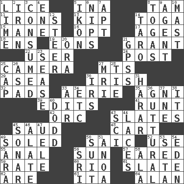 ACROSS 1. Louse (plural) 5. _ tizzy (2 wds.) 8. Scottish cap 11. Removes the wrinkles 13. Monetary unit of Laos 14. Ancient Roman robe 15. French painter Edouard 16. Choose 17. Matures 18. Followers of ems 19. Immeasurably long periods of time 21. Let have 22. One who makes use of a thing 24. Mail 25. Device for capturing images 27. Mountains (abbr.) 29. Toward the sea 30. From or relating to Ireland 32. Groovy apts. 33. Nest on high 35. Hindu god of fire 39. Proofreads 41. The smallest animal of a litter 42. The grampus (Milton) 43. Chalkboards 45. Saudi Arabian king (1953-1964) 48. Draw slowly or heavily 49. Having a sole or soles 50. Ketch in the Levant 52. Purpose 55. Of or related to the anus 56. Player for Phoenix 57. Having ears or earlike features 59. Pace 60. _ de Janeiro 61. Chalkboard 62. "We ___ not amused" (Victoria) 63. Call ___ day 64. Actor Alda or Thicke DOWN 1. Welles in "The Third Man" 2. SW Asia republic 3. Eaten 4. Compass dir. 5. Picture 6. Pinches, bites 7. Fitting 8. Ancient Roman robes 9. Representative 10. Vertical spar for supporting sails 12. Guide 14. Edible starchy tuberous root 20. Mouth or opening 21. Global Positioning Systems (abbr.) 23. Gospel singer Marvin 25. Head covering 26. White ___ sheet 27. Medical imaging device (abbr.) 28. Standoff 30. Big collection agency 31. Ethiopian city, capital of Harari 33. Atmosphere 34. And so on (abbr.) 36. From the throat 37. Compass dir. 38. It is 40. Texas town _ City 43. _-fi 44. Shoestrings 45. Echolocation 46. Having winglike extensions 47. Ubangi River tributary 49. "Two Mules for Sister ____" 50. Costume for a special activity 51. Small Philippine buffalo 53. Stalk of a moss capsule 54. Paradise 56. _ Lanka 58. Chicken ___ king