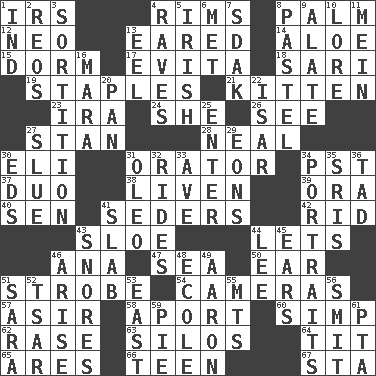 ACROSS 1. Big collection agency 4. Basketball hoops 8. Inside of hand 12. Modern: prefix 13. Having ears or earlike features 14. Medicinal plant 15. Dormintory (informal) 17. Webber/Rice musical 18. Indian skirt 19. Paper fasteners 21. Baby cat 23. Lyricist Gershwin 24. A female animal or person 26. Observe 27. Comedian Laurel of Laurel & Hardy 28. Anneal 30. Connecticut Ivy Leaguer 31. Speaker 34. Pacific Standard Time (abbr.) 37. Superhero pair 38. Make or become more lively 39. Mouth or opening 40. Elected rep. 41. Spring feasts 42. To free from 43. A type of plum 44. Allows 46. Santa ___, CA 47. Ocean 50. Hearing organ 51. Disco prop 54. Devices for capturing images 57. SW Saudi Arabia district 58. To the left, to Queeg 60. Simple or foolish person 62. Raze (variant) 63. Grain storage towers 64. Teat (slang) 65. Ancient Greek god of war 66. Adolescent 67. R.R. building DOWN 1. Working for oneself (abbr.) 2. Vintage cars 3. Decision 4. All-night dance parties 5. From or relating to Ireland 6. Was introduced to 7. Neighbor of Neb. 8. Soft color 9. Having winglike extensions 10. Old wives' tales, e.g. 11. Chow _ 13. Snakelike fish 16. Hindu Mythology: god of death 20. Baking dish 22. Austrian river, tributary to the Danube 25. Keyboard key 27. Turn sharply 29. Immeasurably long periods of time 30. Begley and Asner 31. Margarine 32. Amusement-park features 33. "___ Maria" 34. Likenesses of persons 35. Indian titles of respect 36. Small amount or degree 41. Thick slice 43. Sounds asleep 44. Area sheltered from the wind 45. Hearing organs 46. Get up 48. Learning spot: Fr. 49. Composer Copland 51. "Two Mules for Sister ____" 52. Russian ruler of old 53. 90 degrees 55. Mountains (abbr.) 56. Stricken, poetically 59. Sliced dessert 61. Parent Teacher Assoc.