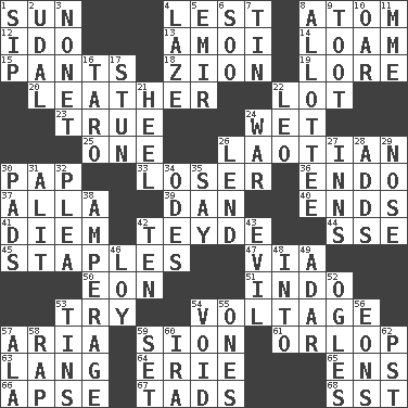 ACROSS 1. Player for Phoenix 4. For fear that 8. Tiny particle 12. Wedding promise 13. Mine, in Marseilles 14. Rich soil 15. Leg coverings 18. The Jewish people; Israel 19. Old wives' tales, e.g. 20. Cordwainer's material 22. Car dealer's back yard 23. Loyal 24. Soggy 25. Single 26. Of or relating to Laos or its people 30. Infant food 33. Failure 36. Inside; within (prefix) 37. Silent film actress Nazimova 39. Daniel's nick name 40. Conclusions 41. South Vietnam president (1954) 42. Miss Universe 1986, Barbara Palacios _ 44. Compass dir. 45. Paper fasteners 47. By way of 50. Age 51. Southeast Asian peninsula 53. Attempt to accomplish something 54. Electrical Measurement 57. Roberta Peters solo 59. The Jewish people; Israel 61. Lowest deck of a ship 63. Long (Scottish) 64. 4th largest of the Great Lakes 65. Followers of ems 66. Domed church section 67. Small amounts or degrees 68. Fast jet (abbr.) DOWN 1. Small drink 2. Hereditary estate 3. Music written for nine 4. Goldbrick 5. Independent ruler or chieftain 6. "Barney Miller" actor Jack 7. Shallow baking pan 8. One to whom something is allotted 9. A blast of a horn 10. Boat paddle 11. Madame (abbr.) 16. Edible starchy tuberous root 17. Surprise greatly 21. The bottom of a shoe or boot 22. Lion 24. Armed conflict 26. Grant temporary use of 27. Lodging establishments 28. Does sums 29. Characteristic smell of wine 30. Writing tablets 31. Set down 32. Entreaty 34. Lyric poems 35. Declare 38. Electrical Measurement 42. "___ Little Indians" 43. Morally bad or wrong 46. Myrna of the movies 48. To the inside or interior of 49. The sixth month of the Jewish calendar 52. Stares 53. Canisters 54. State of nonexistence 55. Washington bills 56. Immeasurably long periods of time 57. According to 58. Reproach for some lapse or misdeed 59. Put into a specified state 60. Retirement account (abbr.) 62. Pacific Standard Time (abbr.)