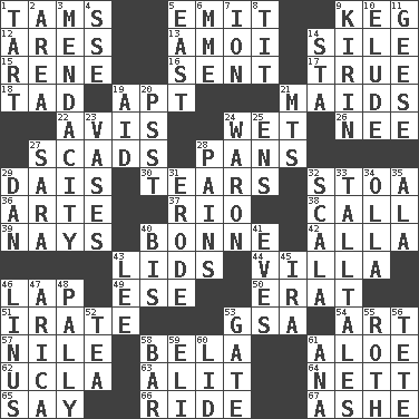ACROSS 1. Scottish caps 5. Give off 9. Cask 12. Ancient Greek god of war 13. Mine, in Marseilles 14. Drop; flow; fall 15. French philosopher Descartes 16. Transmitted 17. Loyal 18. Bit 19. Fitting 21. Women servants 22. Advice 24. Dripping 26. Born 27. Oodles 28. Baking dishes 29. Raised platform 30. Separates forcefully 32. Portico 36. Johnson of "Laugh-In" 37. _ de Janeiro 38. Give a ring to 39. Negative votes 40. Child's nurse 42. Silent film actress Nazimova 43. Flaplike coverings 44. Country estate 46. Infant locale 49. Compass dir. 50. Part of Q.E.F. 51. Feeling or showing extreme anger 53. Girls' org. (abbr.) 54. Nonscientific branch of learning 57. "Death on the ____" 58. Actor Lugosi 61. _ vera 62. Southern CA. univ. 63. Came down and settled, as after flight 64. Remaining after all deductions 65. Declare 66. Travel on or in a vehicle 67. American tennis player Robert DOWN 1. Small pie 2. Length times width 3. Ananias' fault 4. Compass dir. 5. Compass direction 6. Madame (abbr.) 7. Electrically charged atom 8. Teat (slang) 9. Japanese brewing company 10. Evade 11. Honkers 14. R.R. building 19. Assist 20. Inconspicuous attention getter 21. Mountains (abbr.) 23. Flower holders 24. Make _____ (do battle with) 25. Followers of ems 27. "Two Mules for Sister ____" 28. Aches 29. One of the 12 tribes of Israel 31. Wear away 32. Any of the three canals of the cochlea 33. Baron Munchausen's specialties 34. Spanish pot 35. Wing 40. Twice 41. Nights before holidays 43. Area sheltered from the wind 45. Lyricist Gershwin 46. "_ and Lucy" (Charlie Brown theme song) 47. N. Chile seaport 48. Friendly 52. Beverage made from leaves 53. Yard entry 55. Writer of Portnoy's Complaint (1969) 56. Wig 58. Long, evenly shaped piece 59. Connecticut Ivy Leaguer 60. Flaplike covering 61. Santa ___, CA