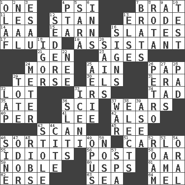 ACROSS 1. Single 4. Air pressure measure (abbr.) 7. Naughty child 11. French article 12. Comedian Laurel of Laurel & Hardy 13. Eat (away) 14. American Automobile Association (abbr.) 15. Merit 16. Chalkboards 17. Watery 19. Aide 21. Commissioned military rank (abbr.) 23. Eons 24. Greater amount 25. The 18th letter of the Arabic alphabet 26. Infant food 29. Laconic 30. Raised railways 31. Epoch 32. Car dealer's back yard 33. Big collection agency 34. Small amount or degree 35. Had dinner 36. _-fi 37. Erodes 40. For each 41. Area sheltered from the wind 42. In addition 43. Skim 45. Portuguese money of account (variant) 46. Decision 51. Monte _, Las Vegas Hotel/Casino 55. Foolish or stupid persons 56. Mail 58. Rowing implement 59. Impressive in appearance 60. United States Postal Service (abbr.) 61. Nursemaid (var.) 62. Celtic language 63. Ocean 64. Cartoonist voice _ Blanc DOWN 1. Norwegian king 2. Be tempered by heat 3. Son of Isaac 4. Parent Teacher Association (abbr.) 5. "Two Mules for Sister ____" 6. Restaurants 7. Naughty children 8. Round or rotation of duties 9. An important port of Yemen 10. Trial 12. Spring feasts 13. Otherwise 16. Public displays of written messages 18. Russian composer Stravinsky 20. Moves on water 22. Born 24. Distance measurement 25. Nest on high 26. Stone: prefix 27. Ancient river in northeast Turkey 28. Writing tablet 29. Lug 32. Pet locale 33. Ancient Celtic tribe of eastern Britain 36. Narrow boards 37. Armed conflict 38. Opts 39. Toward the sea 43. Fur scarf 44. Quote 46. Trig term 47. Scent 48. Chest bones 49. Musical composition 50. Olfactory organ 52. Wander 53. Unable to walk 54. Spoken 57. Health resort