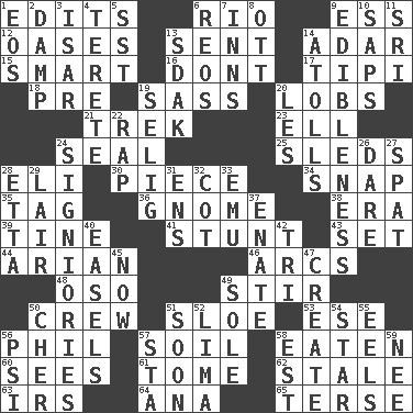 ACROSS 1. Prepares for publication 6. _ de Janeiro 9. Double-curved letter 12. Fertile tracts in a desert 13. Emitted 14. The sixth month of the Jewish calendar 15. Don Adams' spy role 16. Do not 17. Native american tent (variation) 18. Before (prefix) 19. Backtalk 20. Tennis shots 21. Long journey 23. Pipe bend 24. Lick closed 25. Bobsleighs 28. Connecticut Ivy Leaguer 30. Part 34. Fastener 35. Label 36. Dwarf 38. Period 39. Prong on a fork 41. Check the growth or development of 43. Arrange properly for use 44. Believer in; advocate of (suffix) 46. Curves 48. Bear (Spanish) 49. Use a spoon 50. Ship's personnel 51. A type of plum 53. Compass dir. 56. Silvers or Donahue 57. Earth 58. Ingested 60. Observes 61. Heavy book 62. Lacking originality or spontaneity 63. Big collection agency 64. Santa ___, CA 65. Laconic DOWN 1. Greek goddess of the dawn 2. Moist 3. Austrian river, tributary to the Danube 4. Cigar-shaped 5. Fast jet (abbr.) 6. Vintage cars 7. Taverns 8. Baseball player Mel 9. The property of being fit to eat 10. Plant excrements 11. Indian title of respect (Mr.) 13. Neighbor of Neb. 14. Ringlike coral islands and reefs 19. Former Milwaukee Brewers owner Bud 20. French article 22. Strike 24. Seigniories (variant) 26. Have the gumption 27. Petty quarrel 28. Singer James 29. Den 31. Followers of ems 32. Small bed 33. Australian flightless bird 37. Maternal 40. Artist's stands 42. Three (prefix) 45. Immediately 47. Make 49. Flatfish 50. "Mermaids" star 51. Within a short period 52. Pale green bean 54. Play the lead 55. Snakelike fish 56. Air pressure measure (abbr.) 57. R.R. building 58. Eastern Standard Time (abbr.) 59. Born