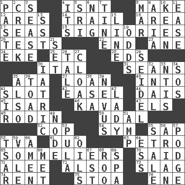 ACROSS 1. Personal Computers (abbr.) 4. Is not 8. Create 12. Ancient Greek god of war 14. Go after with the intent to catch 16. Type of rug 17. Oceans 18. Seigniories (variant) 20. Trials 22. Conclude 23. One (Scot) 24. Supplement with great effort 25. And so on (abbr.) 28. Begley and Asner 30. Slanted text style (abbr.) 31. Actors Connery and Penn 35. "One Day ___ Time" 37. Grant temporary use of 40. To the inside or interior of 41. Groove 42. Artist's stand 44. Raised platform 45. Austrian river, tributary to the Danube 46. Polynesian shrub of the pepper family 47. Raised railways 48. "The Thinker" sculptor 50. Allodial 52. Police officer (slang) 54. Symbol (abbr.) 55. Plant excrement 58. Federal power corp. 61. Superhero pair 63. Stone: prefix 65. Wine waiters 70. Alleged 71. Toward shelter 72. Columnist Joseph or Stewart 73. Volcanic refuse 74. Monthly bill 75. Portico 76. Compass dir. DOWN 1. Thick mixture 2. Small stream 3. Gospel singer Marvin 4. It is 5. Indian title of respect (Mr.) 6. Tired old horse 7. Prong on a fork 8. Third mo. 9. Operatic vocal solo 10. Peachy ____! 11. Relaxation 13. Fast jet (abbr.) 15. Actor's bit 19. Likelihood 21. Put into a specified state 26. Lie 27. Cover or conceal 29. Beer mug 30. Of or pertaining to medicine 32. Of or related to the anus 33. Nuclear Threat Initiatives 34. Mayday 35. In addition 36. Frog relative 38. White ___ sheet 39. Mole, birthmark 41. Title for a knight 43. Kenny Rogers chart-topper in '80 49. Connecting point 51. Electrical Unit 53. Monetary unit of Botswana 55. Showing deterioration from age 56. Believer in; advocate of (suffix) 57. Porridge 58. Russian ruler of old 59. Short-tailed, large-bodied rat 60. So be it 62. Lubricates 64. Double-curved letter 66. Was introduced to 67. Eastern Standard Time (abbr.) 68. Friend of Pooh 69. Health resort