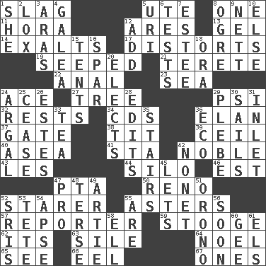 ACROSS 1. Volcanic refuse 5. Shoshoni 8. Single 11. Israeli folk dance 12. Ancient Greek god of war 13. Set 14. Glorifies 17. What propaganda does 19. Oozed 21. Cigar-shaped 22. Of or related to the anus 23. Ocean 24. Adept person 27. Woody plant 29. 23rd letter of the Greek alphabet 32. Musical pauses 34. Music discs 36. Liveliness 37. Yard entry 38. Teat (slang) 39. To provide with a ceiling 40. At sea 41. R.R. building 42. Having high moral qualities 43. French article 44. Grain storage tower 46. Eastern Standard Time (abbr.) 47. Parent Teacher Association (abbr.) 50. Western Nevada city 52. A viewer who gazes fixedly 55. Michaelmas daisies 57. Newsperson 59. Moe Howard, for one 62. ___ a Wonderful Life 63. Drop; flow; fall 64. Christmas carol 65. Observe 66. Snakelike fish 67. Washington bills DOWN 1. A female animal or person 2. Brine-cured salmon 3. Ancient river in northeast Turkey 4. An organ shaped like a helmet 5. RI univ. 6. Trials 7. First name in cosmetics 8. Legendary monster 9. Remaining after all deductions 10. Otherwise 12. Say or write further 15. Portable shelters 16. Practice fight 18. Mouth or opening 20. Chooses 24. Therefore, facetiously 25. Desist 26. _____ Park, CO 28. Prepares for publication 29. Military trainee 30. Moves on water 31. An arm off of a larger body of water 33. Afternoon social gathering 35. Flight of steps 36. Environmental prefix 42. Music written for nine 45. Allows 47. Adept person 48. Laconic 49. Nick name for Arthur 51. U. of Maine site 52. Indian titles of respect 53. Wig 54. Domed church section 55. "We ___ not amused" (Victoria) 56. Within a short period 58. Pipe bend 60. Turn to the right 61. Raised railways