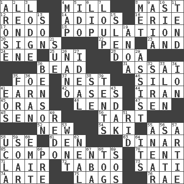 ACROSS 1. Everything 4. Place where flour is made 8. Vertical spar for supporting sails 12. Vintage cars 14. Goodbye (Sp.) 16. One of the Great Lakes 17. Southwest Nigerian state 18. Census information 20. Omens 22. Animal enclosure 23. Added to 24. Compass dir. 25. Single; one (prefix) 28. ___ good deed 30. Necklace unit 31. Slender Brazilian palm 35. Enemy 37. Egg locale 40. Grain storage tower 41. Merit 42. Fertile tracts in a desert 44. SW Asia republic 45. Mouths or openings 46. Grant temporary use of 47. Elected rep. 48. Sir (Sp.) 50. Small pie 52. ___ Haven, CT 54. What Jean-Claude Killy likes to do 55. White ___ sheet 58. Purpose 61. Lair 63. Middle Eastern gold or silver currency 65. Pieces 70. Portable shelter 71. Den 72. Off limits 73. Suttee (variant) 74. Johnson of "Laugh-In" 75. Fails to keep up a pace 76. Actress Charlotte DOWN 1. Came up 2. Soviet premier 1918-24 3. Cabin 4. Atlas unit 5. Wedding promise 6. Mouth edge 7. Central Nebraska county 8. Was introduced to 9. Roberta Peters solo 10. The Jewish people; Israel 11. Watch over 13. Male offspring 15. Downhill vehicle 19. Small Philippine buffalo 21. Take to court 26. Billionth: prefix 27. Perfect 29. Aid 30. Gillaume's butler role 32. The founder of a family 33. ____ Jay Lerner 34. Electrically charged atom 35. Conductor's collection 36. NW Algerian seaport 38. Compass dir. 39. Portable shelters 41. Greek goddess of the dawn 43. Neighbor of Neb. 49. Do over again 51. To free from 53. Left 55. Approach 56. Before Barbara or Clara 57. Nick name for Arthur 58. Southern CA. univ. 59. Fly high 60. Give off 62. Actress Patricia 64. It is 66. Before (prefix) 67. Basketball assoc. 68. Coat; cloak 69. Mayday