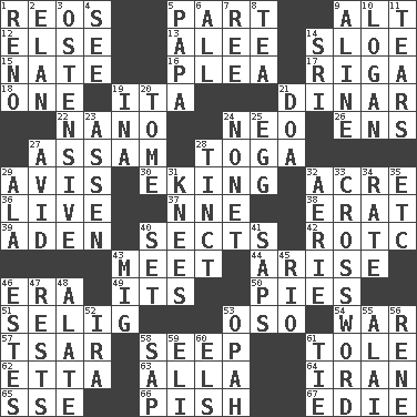 ACROSS 1. Vintage cars 5. Component 9. Keyboard modifier key 12. Otherwise 13. Toward shelter 14. _ gin 15. Nathan's nickname 16. Entreaty 17. Capital of Latvia 18. Single 19. Call ___ day 21. Middle Eastern gold or silver currency 22. Billionth: prefix 24. Modern: prefix 26. Followers of ems 27. Indian state 28. Ancient Roman robe 29. Deliberation 30. Supplementing with great effort 32. Measure of real estate 36. Not recorded 37. Compass dir. 38. Part of Q.E.F. 39. An important port of Yemen 40. Religious groups 42. College mil. group 43. Rendezvous 44. Get up 46. Period 49. It is 50. Sliced desserts 51. Former Milwaukee Brewers owner Bud 53. Bear (Spanish) 54. Armed conflict 57. Russian ruler of old 58. Ooze 61. Lacquered or enameled metalware 62. Singer James 63. Silent film actress Nazimova 64. SW Asia republic 65. Compass dir. 66. Expression of disdain 67. Singer Brickell DOWN 1. Western Nevada city 2. Enthusiasm 3. Clearly or manifestly demonstrative 4. Perceive with the eye 5. Dad 6. Everything 7. To sift 8. Afternoon social gathering 9. Place in a line 10. Utah city north of Ogden 11. Lacerates 14. Indian title of respect (Mr.) 19. _ tizzy (2 wds.) 20. Heavy book 21. ___ good deed 23. NE Netherlands city 24. Music written for nine 25. Oval reproductive body of a fowl 27. Enthusiastic 28. Colored lightly or faintly 29. Insect wing 31. Leg joints 32. Nest on high 33. What you're doing now 34. Pace 35. And so on (abbr.) 40. Put into a specified state 41. Plant excrements 43. Russian fighter aircraft 45. _ de Janeiro 46. _____ Park, CO 47. Musical pauses 48. Having winglike extensions 52. Lyricist Gershwin 53. Brightly colored fish 55. Jai ____ 56. French philosopher Descartes 58. Plant excrement 59. Connecticut Ivy Leaguer 60. Raised railways 61. Standoff