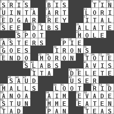 ACROSS 1. Indian titles of respect 5. Twice 8. Shallow baking pan 11. National forest in Provo, Utah 13. Tate display 14. Australian parrot (variant) 15. _ Allan Poe 16. Marina Del _, California 17. Slanted text style (abbr.) 18. Observe 19. Claim 21. Having winglike extensions 22. Blemish 24. Undercover agent 25. Michaelmas daisies 27. Sliced dessert 29. Moves 30. Metal shackles 32. Inside; within (prefix) 33. Person of subnormal intelligence 35. Lug 39. Broad, flat, thick pieces 41. Opinion 42. Call ___ day 43. Erase 45. Saudi Arabian king (1953-1964) 48. One who makes use of a thing 49. Shopping centers 50. Plunder 52. To free from 55. Small Philippine buffalo 56. Direct toward a target or goal 57. Elude 59. Astound 60. Madame (abbr.) 61. Eroded 62. Small amount or degree 63. Baking dish 64. Afternoon social gatherings DOWN 1. Takes to court 2. Travel on an animal 3. Consumed 4. R.R. building 5. Sharp remark 6. Angers 7. Filthy place 8. Add up to 9. Feeling or showing extreme anger 10. The longest river in the world 12. Zeal 14. _ and Stitch 20. ___ a Wonderful Life 21. So be it 23. Mexican monetary units 25. Personal question 26. Male child 27. Adept person 28. Electrically charged atom 30. Big collection agency 31. Showing deterioration from age 33. Floor protector 34. Chief or king in Benin or Nigeria 36. Make much ado about nothing 37. Teat (slang) 38. Compass dir. 40. Hats (slang) 43. Superhero pair 44. First name in cosmetics 45. Before Barbara or Clara 46. Verbally 47. ____ Bator, Mongolia 49. Vertical spar for supporting sails 50. Pale green bean 51. Sign of something about to happen 53. The content of cognition 54. Lairs 56. Electrical Unit 58. Large container