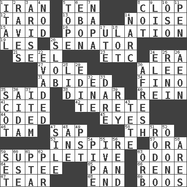 ACROSS 1. SW Asia republic 5. "___ Little Indians" 8. Hoof sound 12. Edible starchy tuberous root 13. Chief or king in Benin or Nigeria 14. Annoying sound 15. Enthusiastic 16. Census information 19. French article 20. Elected representative 21. Sew up the eyelids of hawks and falcons 23. And so on (abbr.) 24. Period 27. Grand slam 30. Toward shelter 31. Tolerated 34. A pale, very dry sherry 35. Stated 38. Middle Eastern gold or silver currency 40. It's straight from the horse's mouth 41. Quote 42. Cigar-shaped 44. Wrote a lyric poem 45. Snake ____ (dice throw) 46. Scottish cap 47. Plant excrement 50. Through, poetically 53. Stimulate to action 57. Mouth or opening 59. Supplying deficiencies 63. Scent 64. First name in cosmetics 65. Baking dish 66. French philosopher Descartes 67. Pull apart 68. Conclusion 69. Expressions of contempt or scorn DOWN 1. Slanted text style (abbr.) 2. All-night dance parties 3. Get up 4. Dreamland 5. Drink excessively 6. Inky black, to poets 7. California wine valley 8. Small bed 9. Cards in a Roman deck? 10. Bear (Spanish) 11. Animal enclosure 14. Drug cop 17. Shoshoni 18. Car dealer's back yard 20. Oscar Madison type 22. Dodged 24. Writer Wiesel 25. Painter Guido (1575-1642) 26. Age 28. Hat (slang) 29. Prepare for publication 30. Anew 32. Compass dir. 33. Have the gumption 35. Native of Scotland 36. Opera by Verdi 37. A distinct part 39. Marina Del _, California 43. Wig 47. Drop; flow; fall 48. A saturated hydrocarbon 49. Pacific Standard Time (abbr.) 51. Cowboy competition 52. U. of Maine site 54. Corncob 55. _ the terrible 56. Tear apart 58. Ancient Greek god of war 59. Arrange properly for use 60. Purpose 61. Parent Teacher Assoc. 62. For each 63. Globe