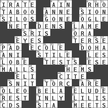 ACROSS 1. Feeling or showing extreme anger 6. The 18th letter of the Arabic alphabet 9. 17th letter of the Greek alphabet 12. Off limits 13. Queen of England 1702-14 14. The Jewish people; Israel 15. Grain storage towers 16. Went 17. Stare 18. Fish or hair follower 19. Hiding places for outlaws 20. Unable to walk 21. Indian titles of respect 23. Mouth or opening 24. Snake ____ (dice throw) 25. Laconic 28. Writing tablet 30. Learning spot: Fr. 34. Capital of the state of Qatar 35. Black tropical American cuckoo 36. Vertical member of a panel or frame 38. French article 39. Ear part 41. Trials 43. Compass dir. 44. Promenades 46. Equivocates 48. Biblical high priest 49. Quote 50. In a ____ (agitated or irritated) 51. Torque (variant) 53. "We ___ not amused" (Victoria) 56. Butter sub 57. Actor Lugosi 58. Evade 60. State of inaction 61. In an inward manner 62. Ms. Damita and namesakes 63. Music discs 64. R.R. building 65. Confronts DOWN 1. It is 2. Precipitation 3. Competent 4. A girl or young woman (variant) 5. Greek goddess of the dawn 6. Soon (poet.) 7. Restaurants 8. Born 9. Complicated, petty procedures 10. Hollow 11. Single 13. Grows older 14. Flew 19. Plates 20. Car dealer's back yard 22. Portuguese money of account (variant) 24. The property of being fit to eat 26. "______ My Girl" (Turtles hit) 27. Comfort 28. Inside of hand 29. Small Philippine buffalo 31. Baseball player Mel 32. Whopper 33. Raised railways 37. Value system 40. American author Paul (1891-1958) 42. Put into a specified state 45. Be seated 47. Ear of corn 49. Supercomputer manufacturer 50. Downhill vehicle 51. Portable shelter 52. Water jar 54. General guideline 55. Prepare for publication 56. The grampus (Milton) 57. Twice 58. Shade tree 59. Curvy letter