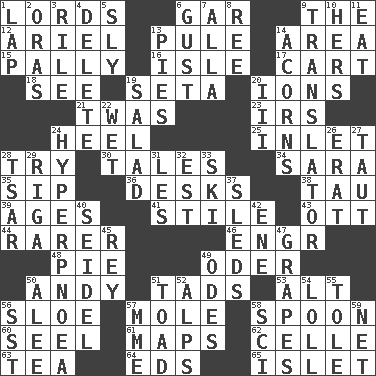 ACROSS 1. Titled peers of a realm 6. Slender fish 9. Definite Article 12. Satellite of Uranus 13. Whimper 14. Length times width 15. Chummy 16. Capri or Wight 17. Heavy open wagon 18. Perceive with the eye 19. Bristle 20. Charged particles 21. It was, poetically 23. Big collection agency 24. Person who is morally reprehensible 25. An arm off of a larger body of water 28. Attempt to accomplish something 30. Lies 34. "Two Mules for Sister ____" 35. Small drink 36. Writing tables 38. The 19th letter of the Greek alphabet 39. Eras 41. Vertical member of a panel or frame 43. Baseball player Mel 44. More valued for its uncommonness 46. Engineer (abbr.) 48. Sliced dessert 49. River in Europe 50. "60 Minutes" Commentator Rooney 51. Bits 53. The first octave above the treble staff 56. A type of plum 57. Undercover agent 58. Soup utensil 60. Stitch closed the eyes of (a falcon) 61. Atlas contents 62. Cell (Danish) 63. Beverage made from leaves 64. Begley and Asner 65. Small island DOWN 1. Infant locale 2. Mouths or openings 3. Cause heat under the collar 4. Keyboard key 5. Stealthy 6. Abrupt rush of wind 7. Silent film actress Nazimova 8. To sift 9. Interpreter 10. Possessive pronoun 11. Erode 13. Sliced desserts 14. Oak nuts 19. First course 20. One more than two 22. Soggy 24. Abnormally rapid or deep breathing 26. Part of Q.E.F. 27. Tense 28. Russian ruler of old 29. Port city in Latvia 31. French article 32. Eastern Standard Time (abbr.) 33. What Jean-Claude Killy likes to do 37. Bobsleighs 40. Beer mug 42. Compass dir. 45. Marina Del _, California 47. Raisin fruits 49. Lyric poems 50. Toward shelter 51. Frog relative 52. High mountains 54. Hang loosely or laxly 55. Lacquered or enameled metalware 56. Fast jet (abbr.) 57. Madame (abbr.) 58. _-fi 59. Fish or hair follower