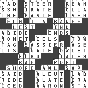 ACROSS 1. Groovy apt. 4. Bull 9. 480, 500 or 516 sheets of paper 13. Compass dir. 14. Feeling or showing extreme anger 15. Rounded earthenware pot or jar 16. Definite Article 17. Thick mixture 18. One who makes use of a thing 19. Shade tree 21. Call ___ day 22. The wife of a rajah (variant) 24. For fear that 26. Working for oneself (abbr.) 27. Remain 29. Extremities 30. Music written for nine 31. Snakelike fish 33. Pull behind 36. Label 37. More disrespectful 40. Grow older 41. It is 42. Yard entry 43. A small or young owl 45. Shade of tan 47. Stories 48. Actress Charlotte 49. Sweet dark-red dessert wine 50. Dinah or Pauly 52. Leather borer 54. Plant excrement 56. Expressed in words 57. Eskimo relative 59. Experiment locale 61. Travel on an animal 62. Having winglike extensions 63. Epoch 64. On the rocks 65. Composer Copland 66. R.R. building DOWN 1. Pacific Standard Time (abbr.) 2. American tennis player Robert 3. Residences 4. Small drink 5. Distinguishing feature 6. Compass direction 7. Singer James 8. To sift 9. Periods in a boxing match 10. Otherwise 11. Toward shelter 12. Make imperfect 20. Ancient Persian 22. Remove soap 23. Added to 25. Arranges properly for use 27. Against 28. Water vessel 29. Writer Wiesel 31. He sold his birthright 32. Eastern Standard Time (abbr.) 33. Baron Munchausen's specialties 34. Double curve, resembling the letter S 35. Soaks 38. Match 39. Printing process, for short 44. Armed conflicts 45. Eaten away 46. Auto 49. Greek god of the underworld 50. Ketch in the Levant 51. Flintstone garb 52. Silent film actress Nazimova 53. Put on (as clothing) 55. Piece 56. Indian title of respect (Mr.) 57. American Automobile Association (abbr.) 58. "___ Little Indians" 60. Sound made by sheep